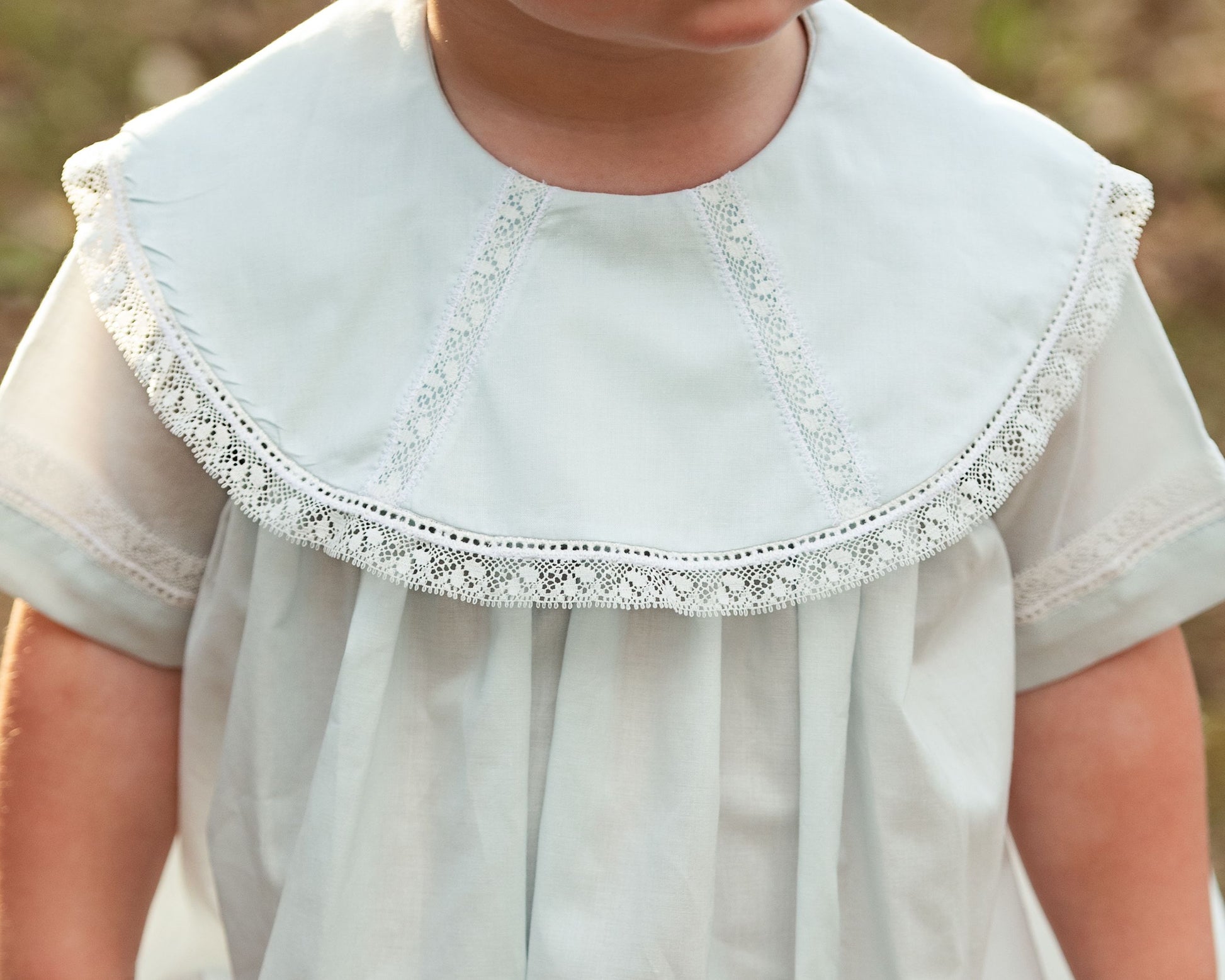 - Pattern: Solid powder blue with white lace collar featuring geometric trim