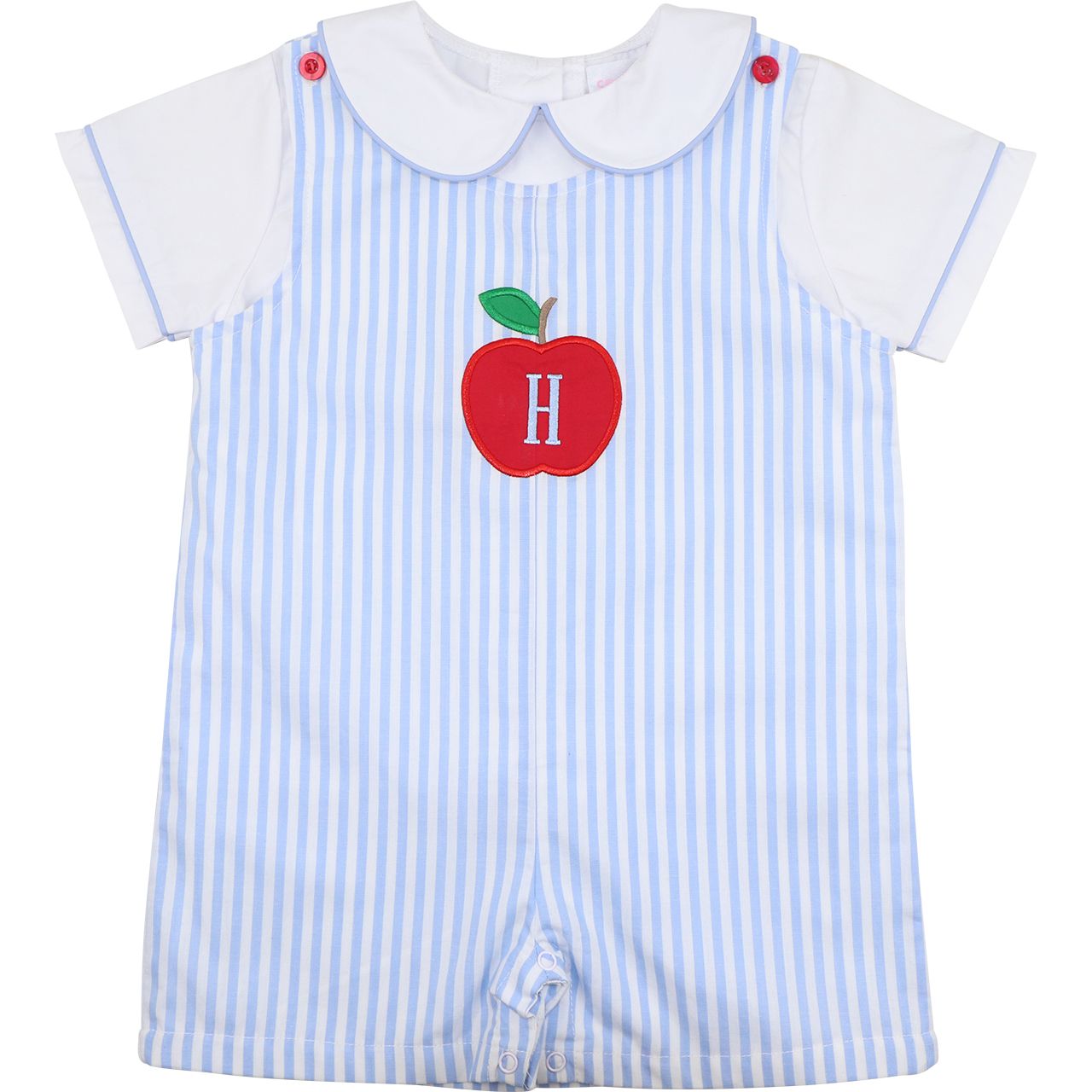 Start the school year off in the sweetest style with our Blue Striped Apple Jon Jon Set, featuring a charming applique red apple with the option of a blue initial for personalization. Paired with a soft knit white peterpan shirt making it classy and fun. Perfect for back-to-school photos, classroom visits, or fall festivities, this precious jon jon makes a smart and stylish statement for your little scholar.