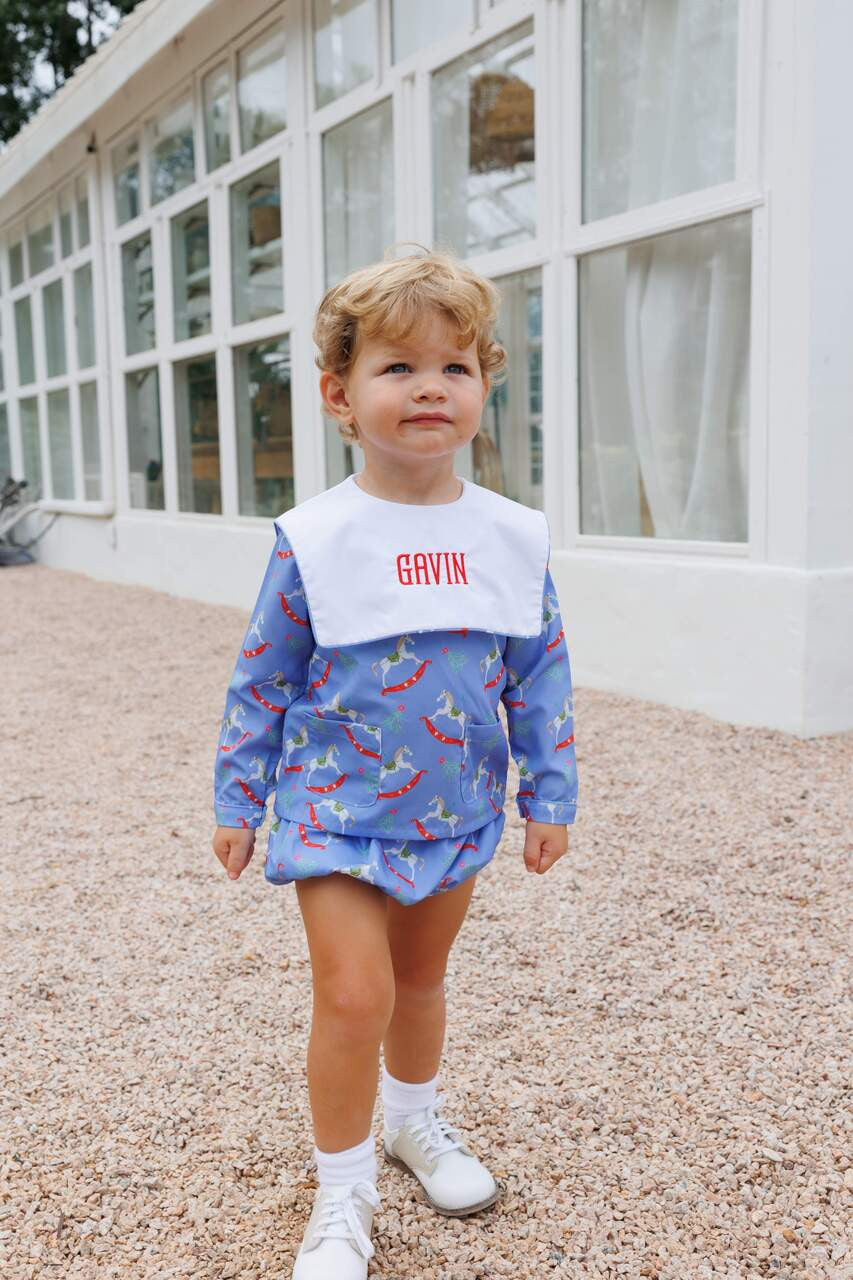 This adorable Blue Rocking Horse Print Diaper Set features a sweet, classic design perfect for special occasions or everyday wear. Made from soft, breathable fabric, it offers all-day comfort while keeping your little one looking charming and picture-ready.