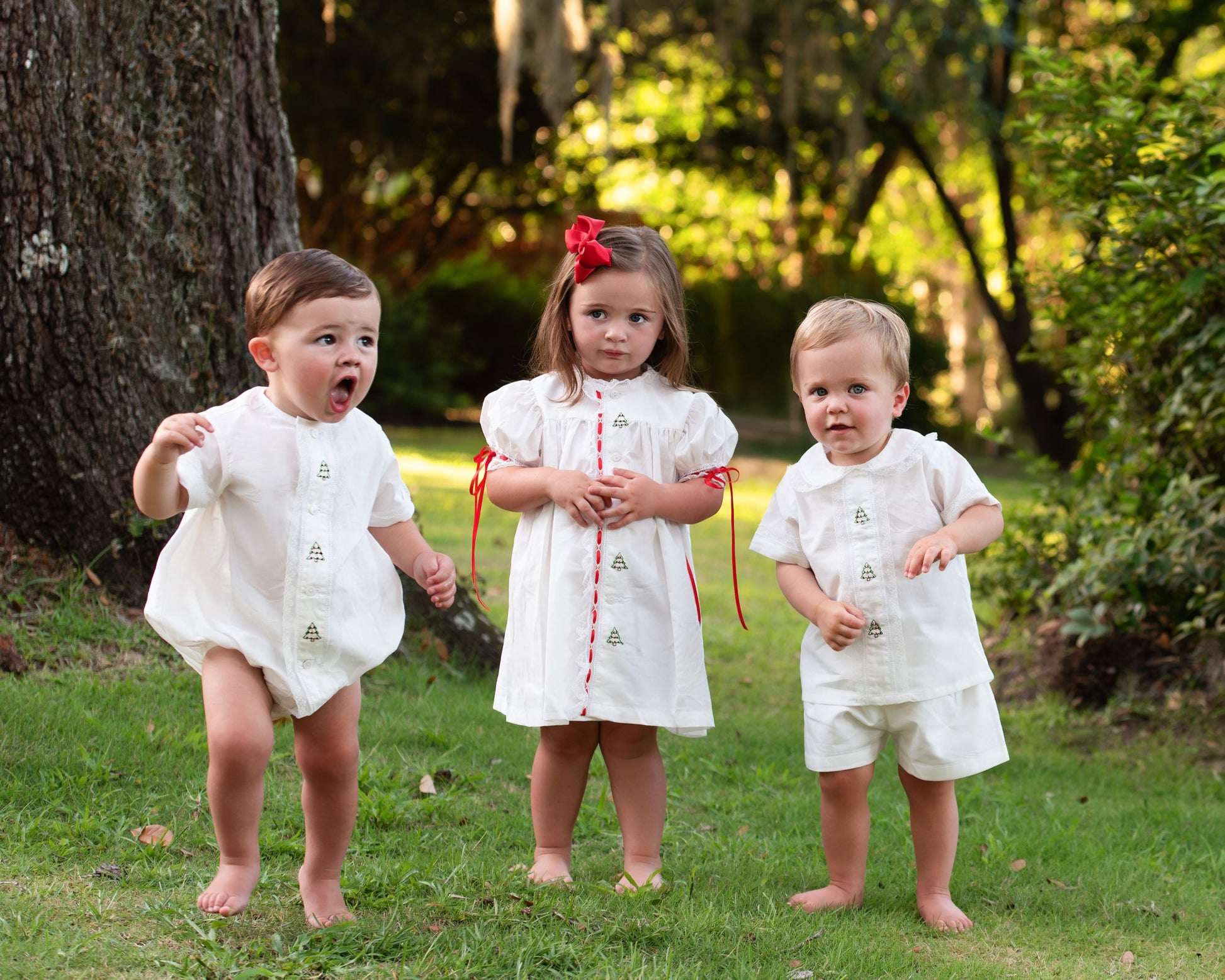 Celebrate the season in vintage-inspired charm with this darling Embroidered Christmas Tree Heirloom Dress, featuring delicate Christmas tree embroidery along a red button placket. Puff sleeves adorned with red ribbon ties and lace trim add a touch of whimsy and elegance. With its heirloom-quality details and festive flair, this dress is a picture-perfect choice for holiday portraits and joyful gatherings.