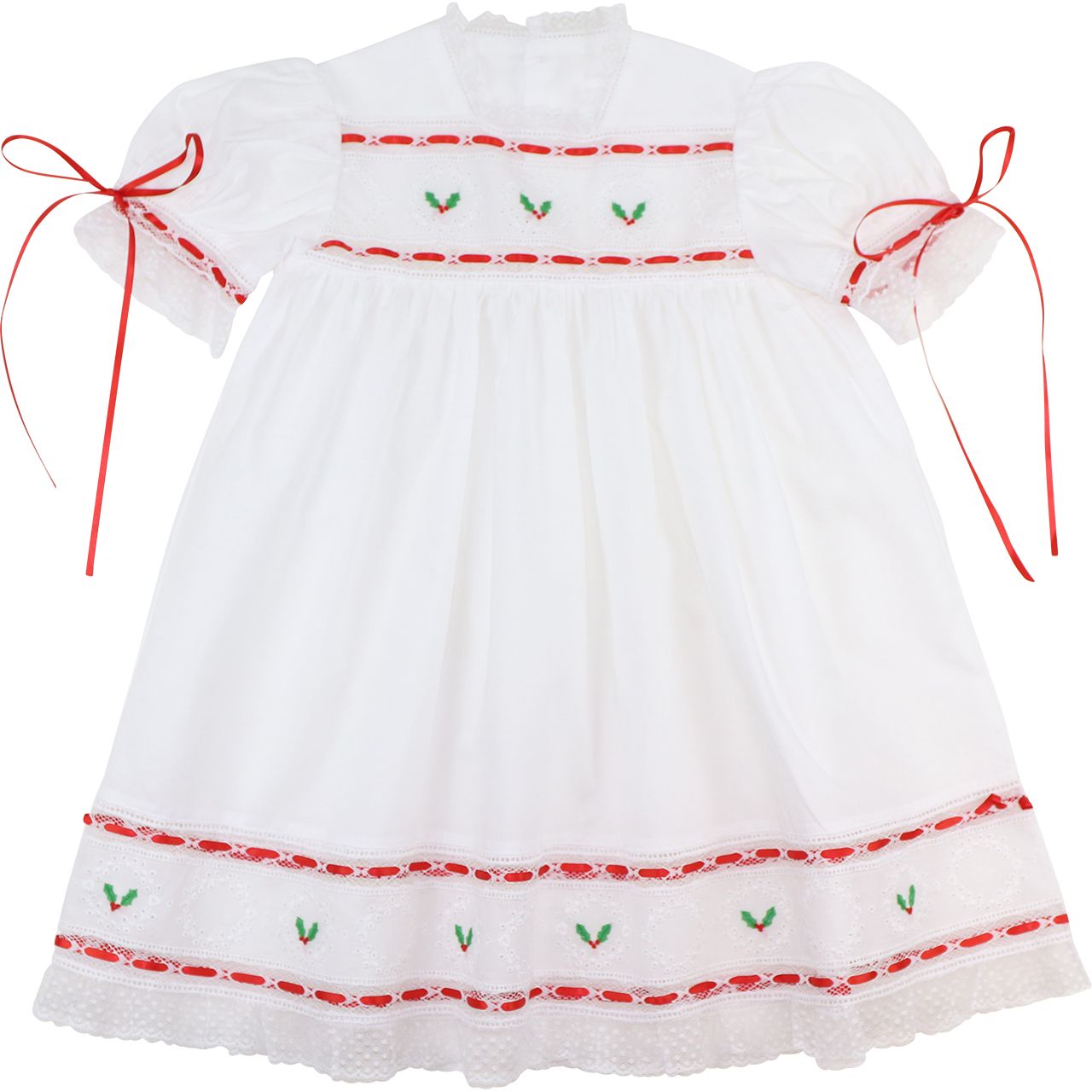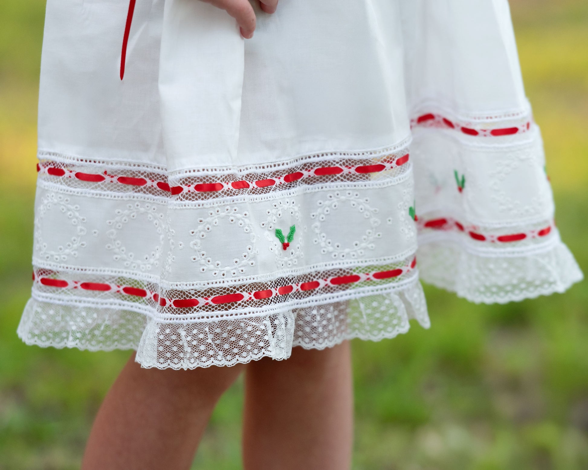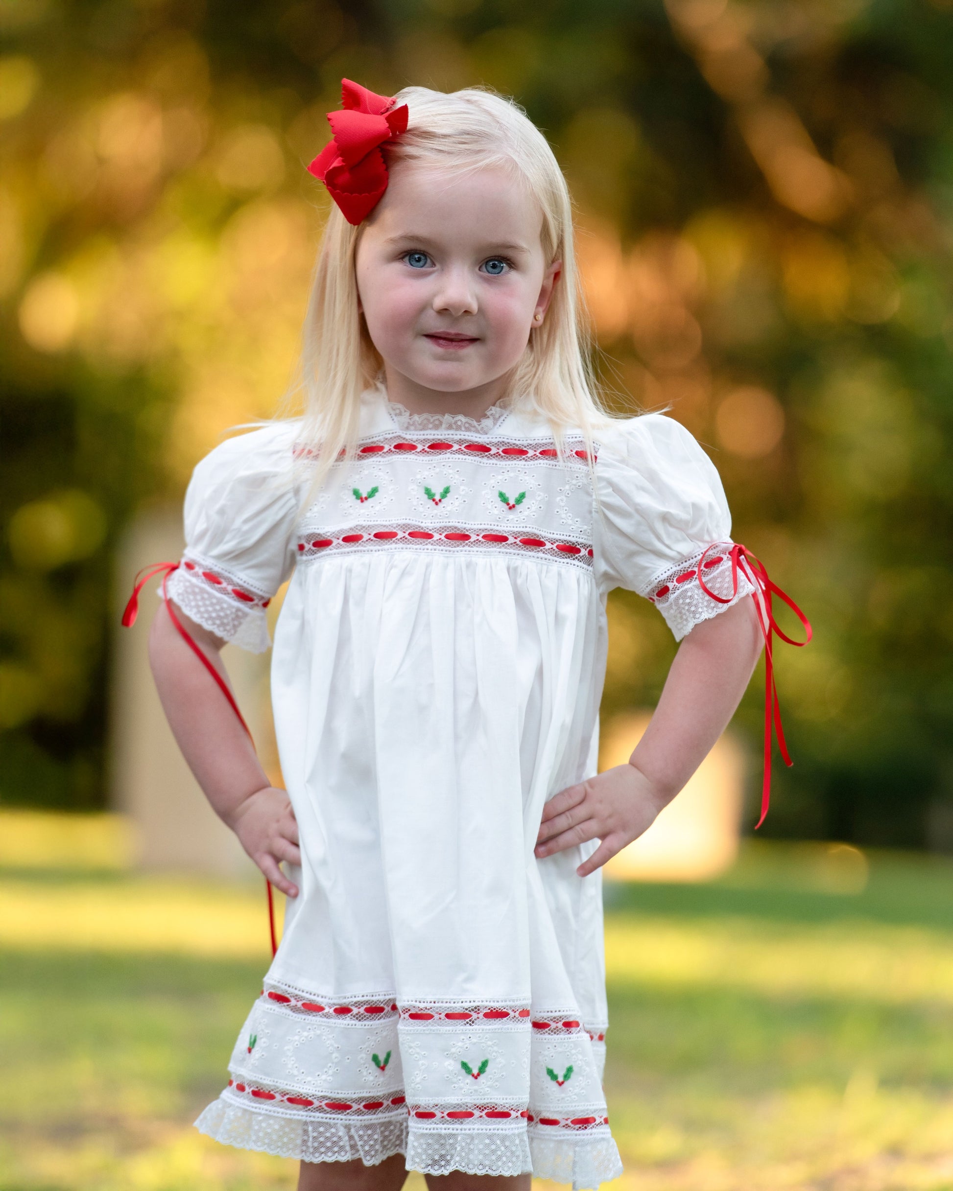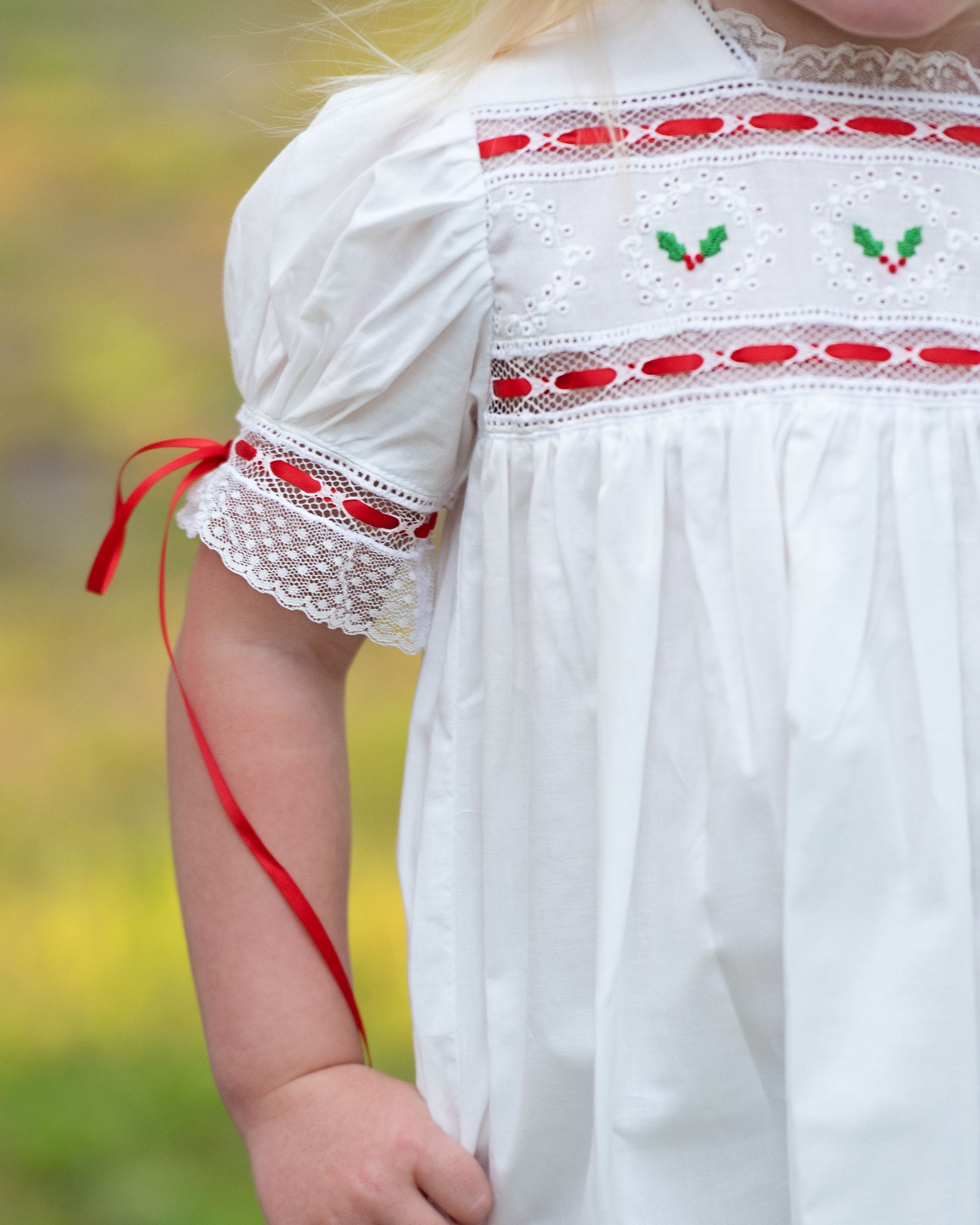 Celebrate the season in timeless style with this Embroidered Holly Heirloom Dress featuring delicate hand-embroidered holly details and vibrant red ribbon accents. Puff sleeves with lace-trimmed ribbon bows and a scalloped hemline add heirloom charm. Perfect for festive occasions, this dress brings classic elegance to your little one's holiday wardrobe.