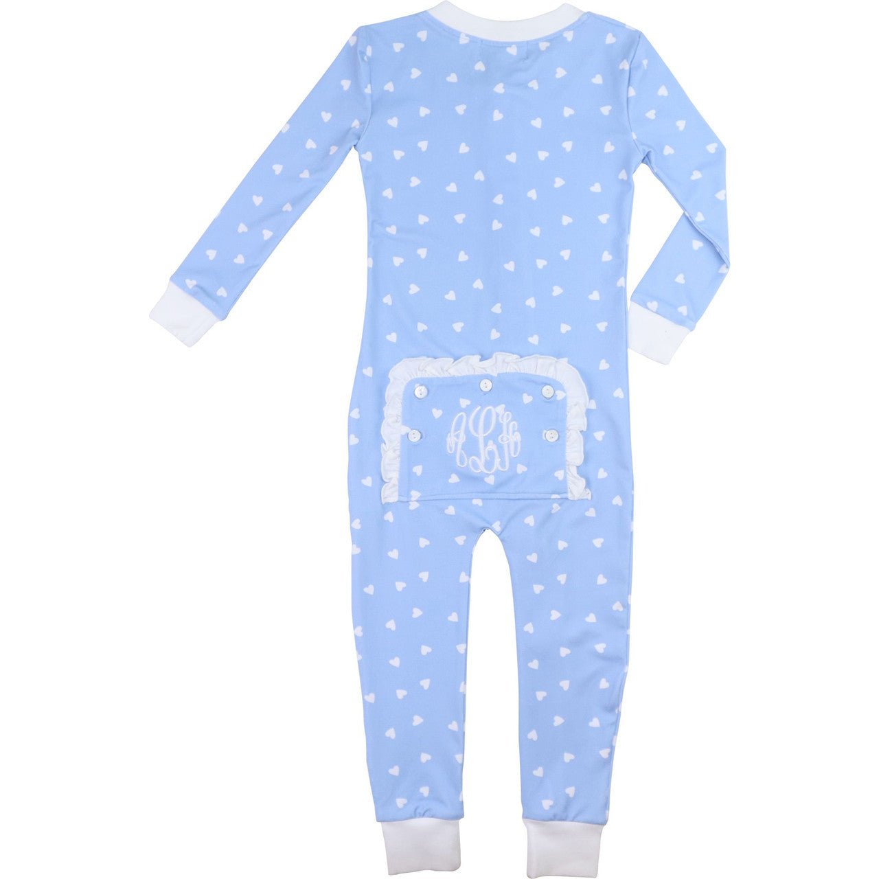 Snuggle up in sweetness with these Blue and White Heart Print Knit Zipper Pajamas, designed for cozy nights and playful mornings. Featuring an allover white heart pattern, soft white cuffs, and a charming ruffle-trimmed rear flap, this one-piece adds a timeless, whimsical touch. Made from soft, stretchy knit fabric, it's perfect for keeping your little one warm and comfy all night long.