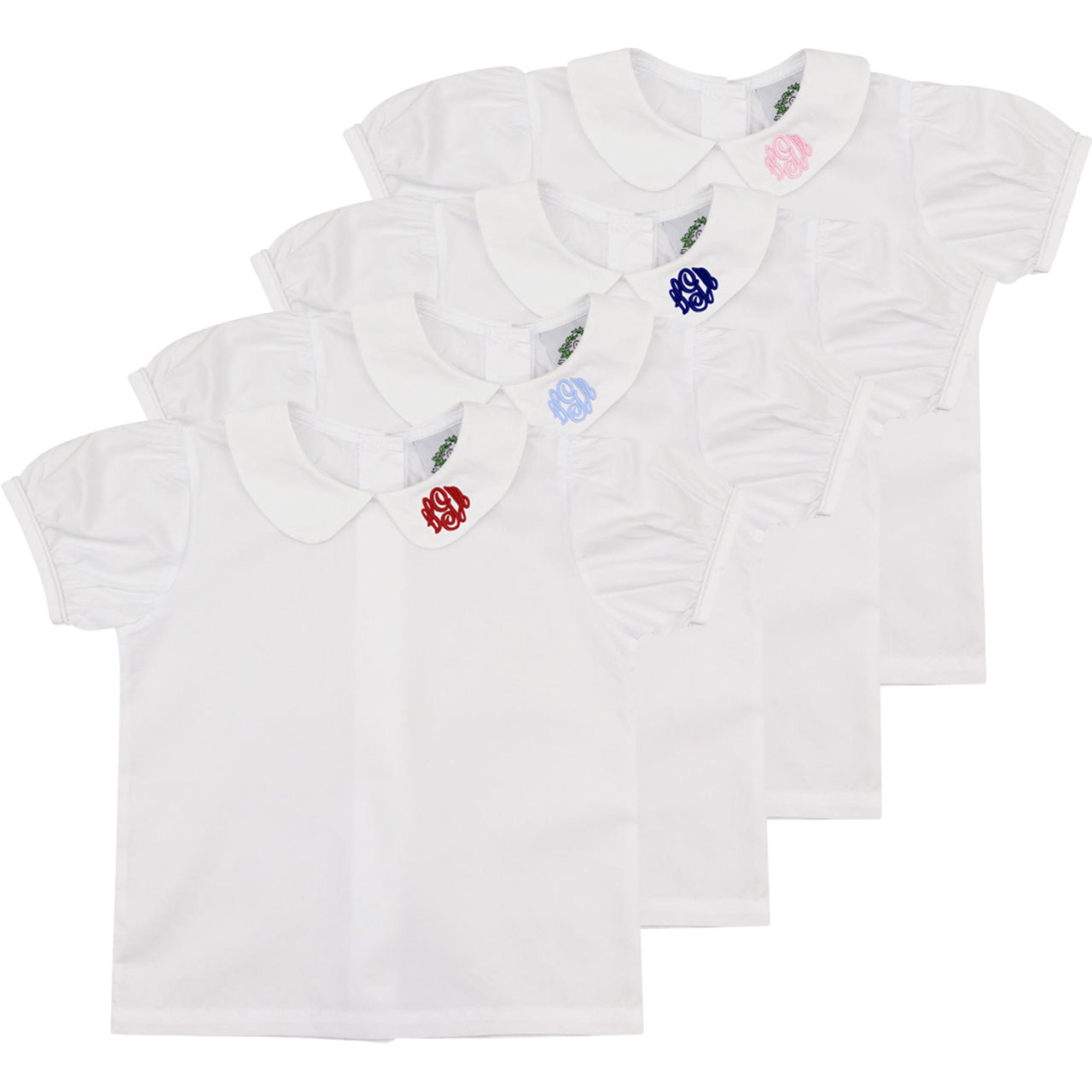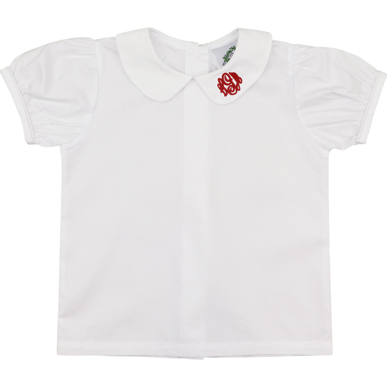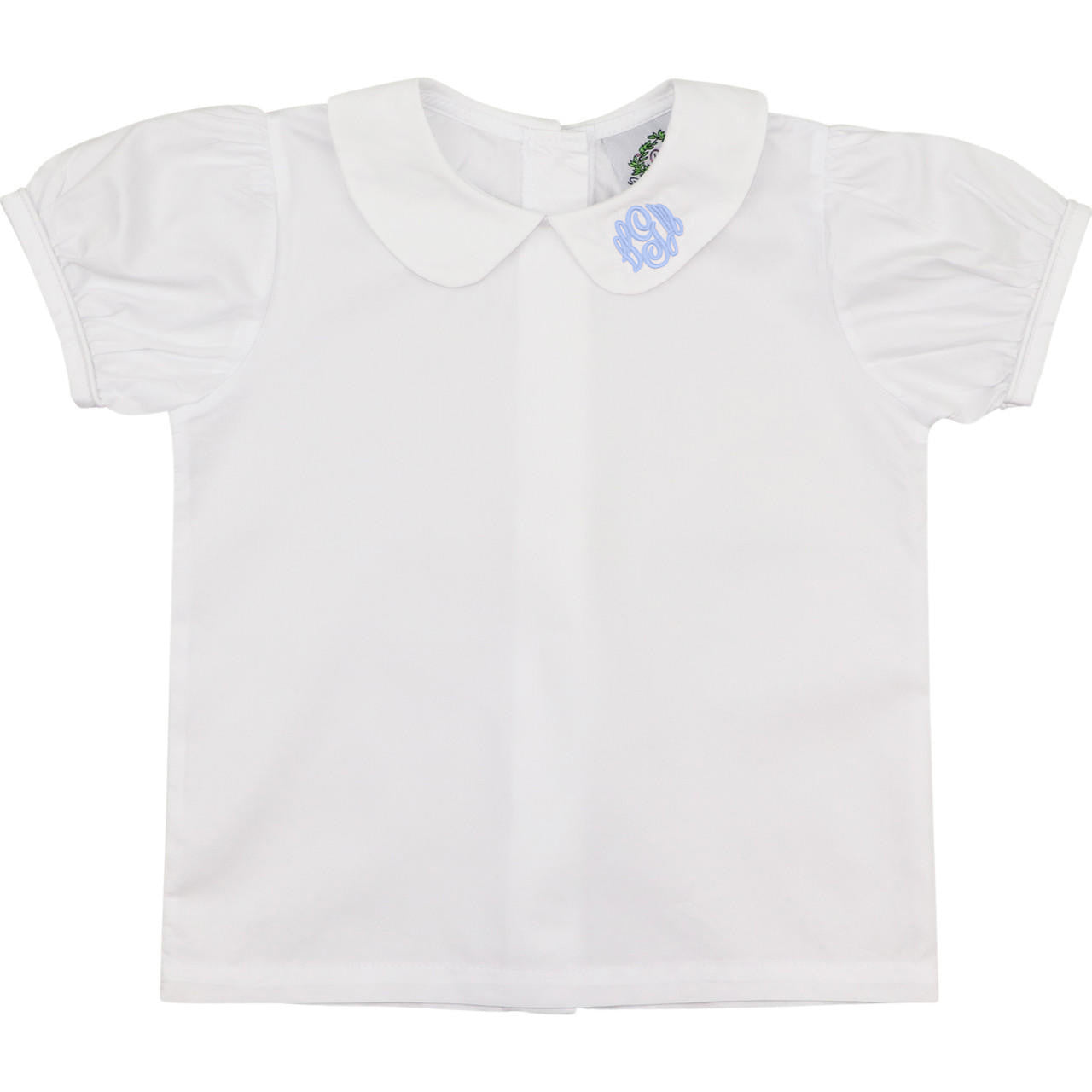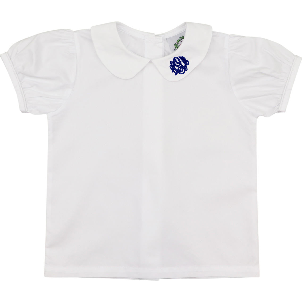 This girls' white Peter Pan collar shirt features delicate puff sleeves and a soft, feminine silhouette perfect for dressing up or layering. Made from breathable, high-quality fabric, it offers all-day comfort with an optional classic monogram embroidered on the collar for a personalized touch. Ideal for special occasions, school days, or everyday elegance, this timeless top is a wardrobe essential.