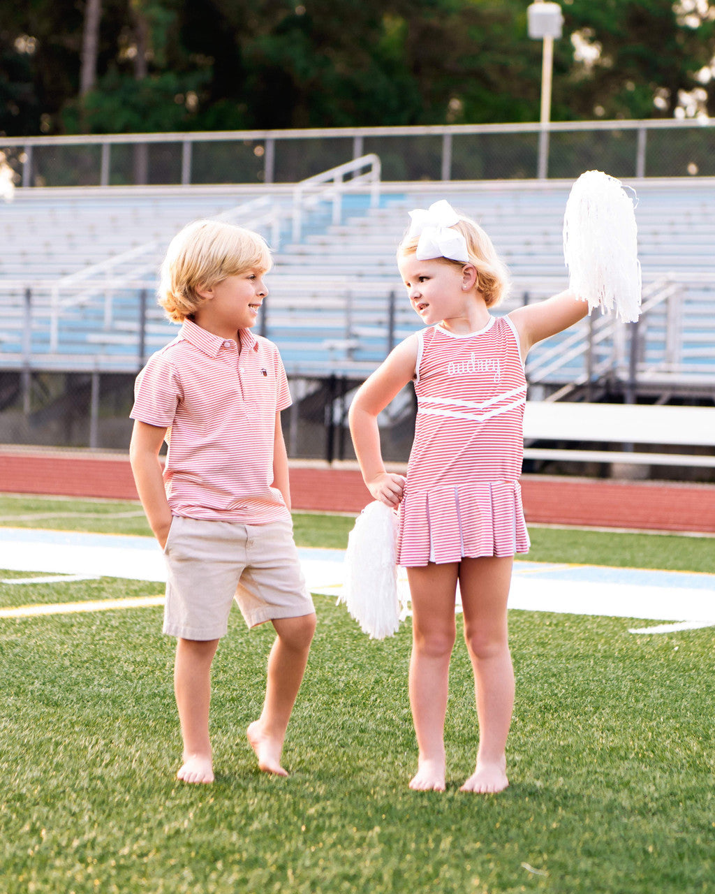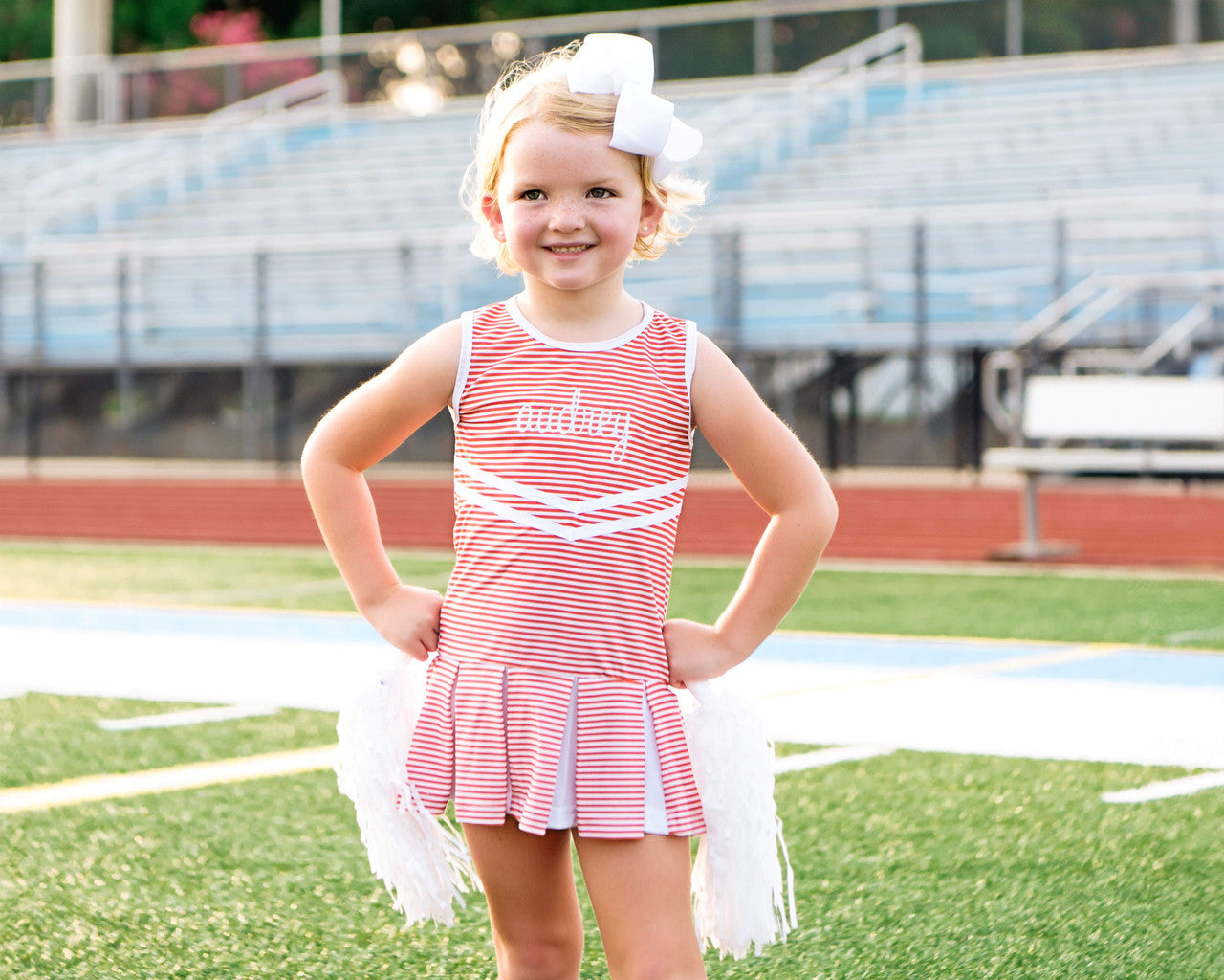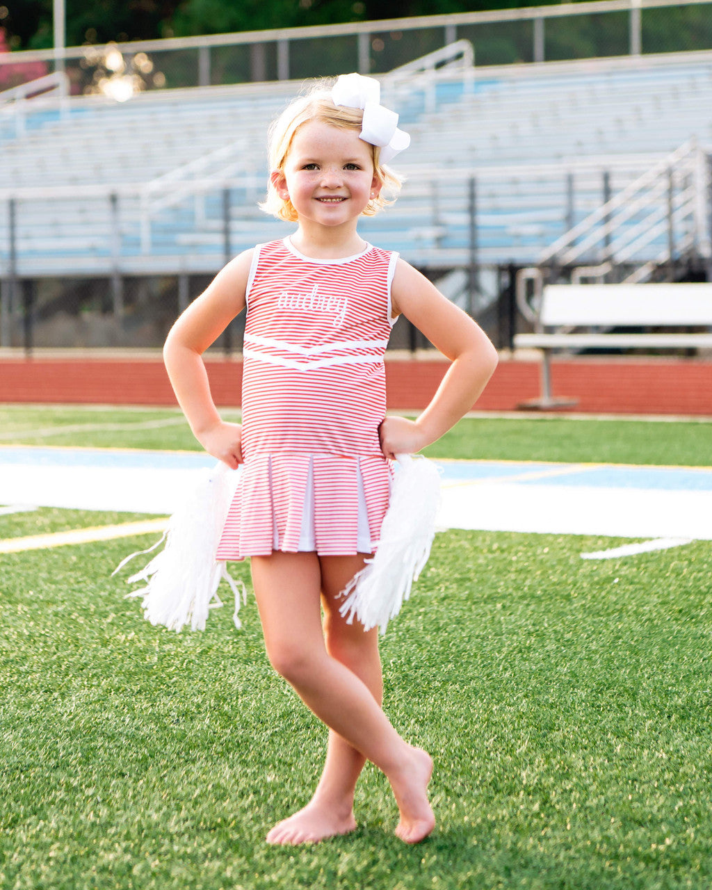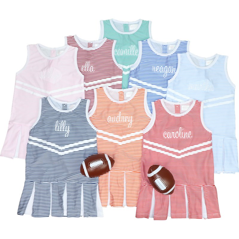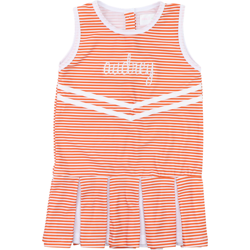 This playful Orange Striped Lycra Tennis/Cheer Dress features a drop-waist pleated skirt and optional personalized name detail. Perfect for summer outings or casual days, it combines a sporty, fun look with a custom touch.