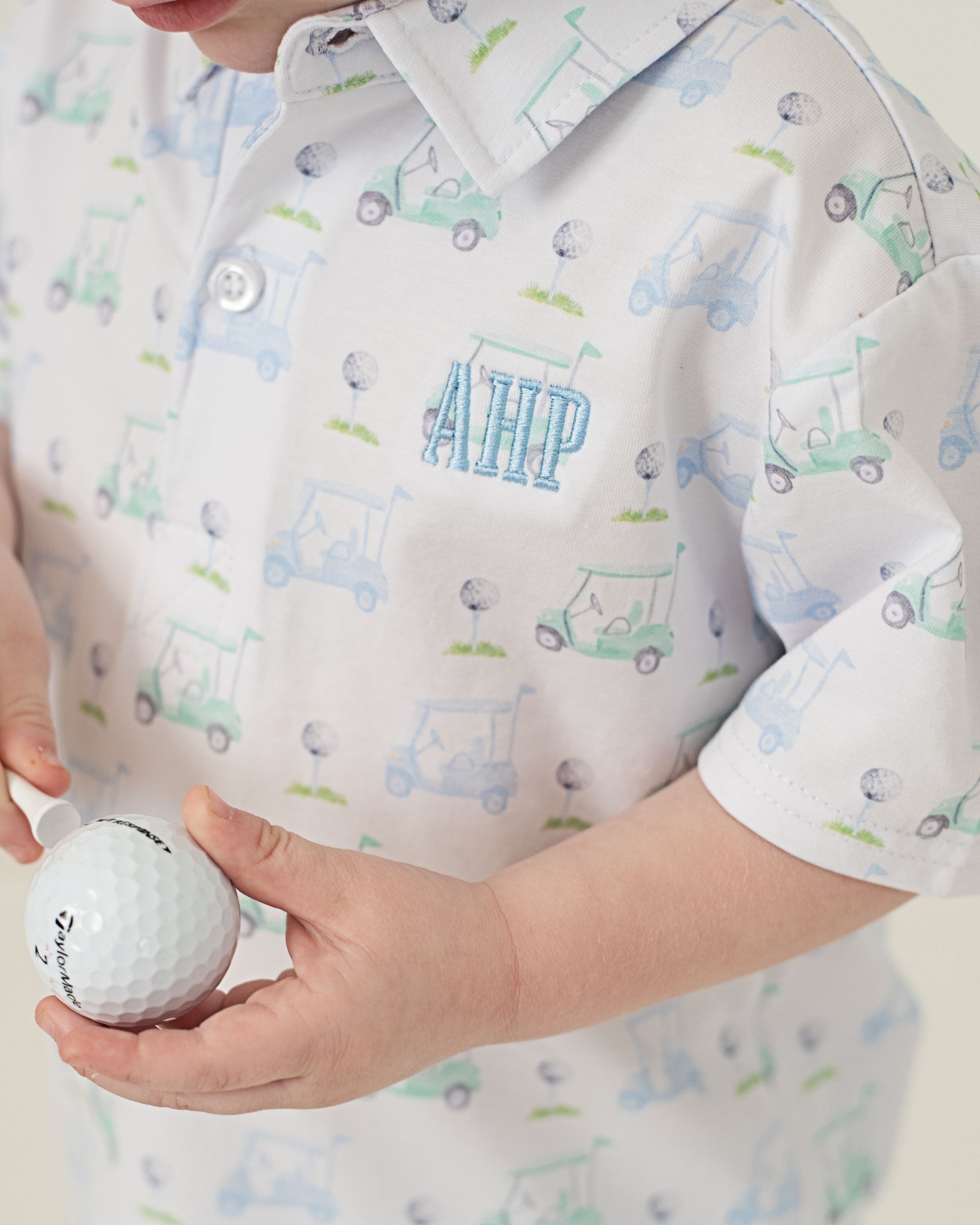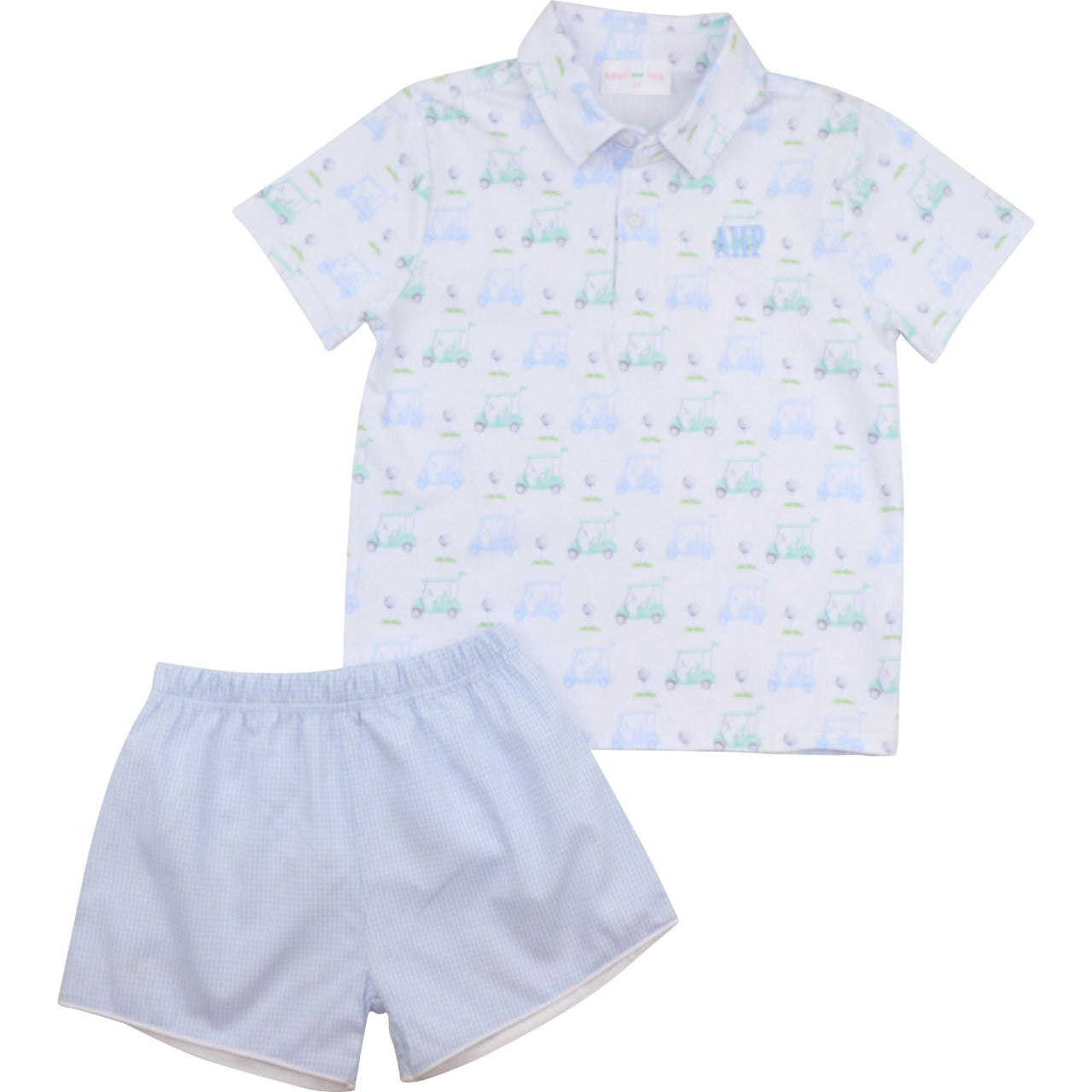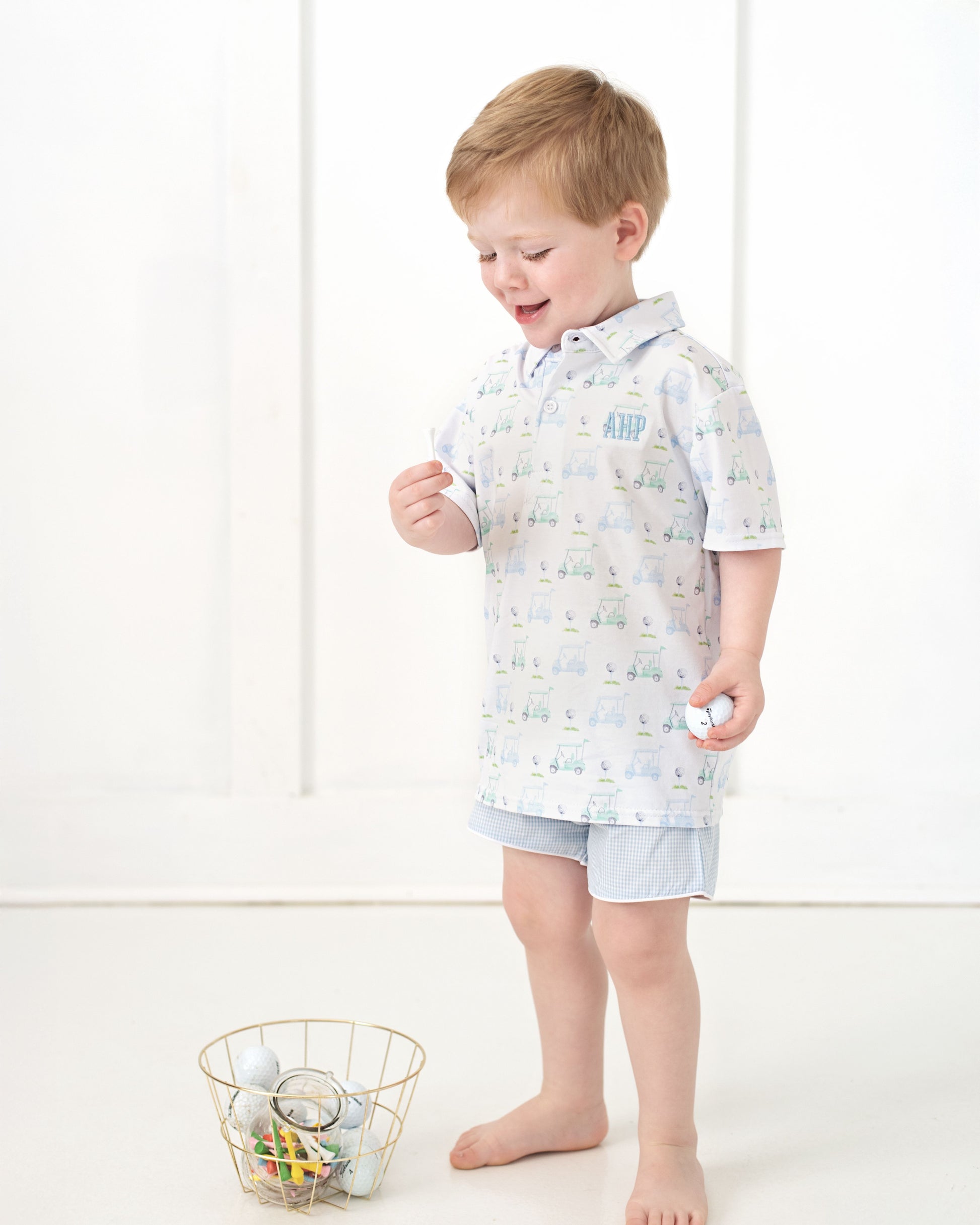 This Golf Print Polo Short Set is a hole-in-one for little golf lovers. Designed with a charming golf cart print polo and coordinating gingham shorts, this outfit is perfect for sunny days on the green, clubhouse lunches, and summer adventures.