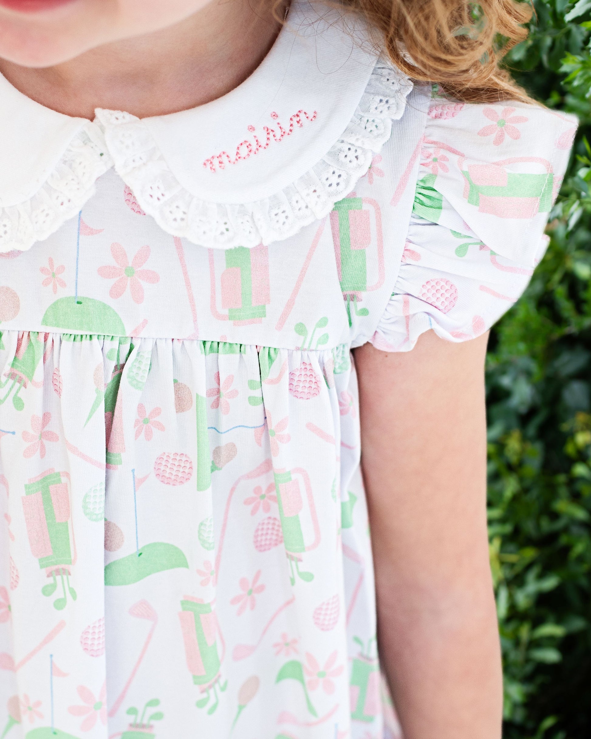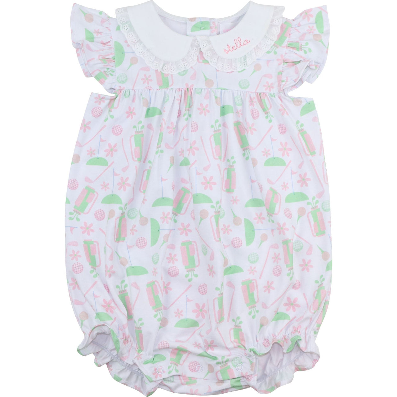 The Green And Pink Knit Golf Bubble is a charming one-piece perfect for little golf lovers, featuring a playful golf-themed print with clubs, balls, and carts. Designed with sweet flutter sleeves, a lace-trimmed collar, and soft knit fabric, this bubble outfit ensures all-day comfort for playdates, family outings, and springtime fun.