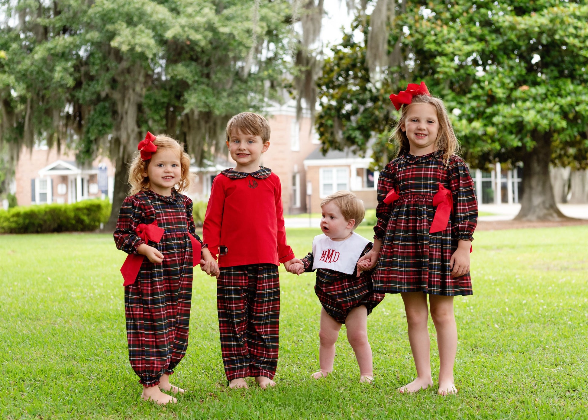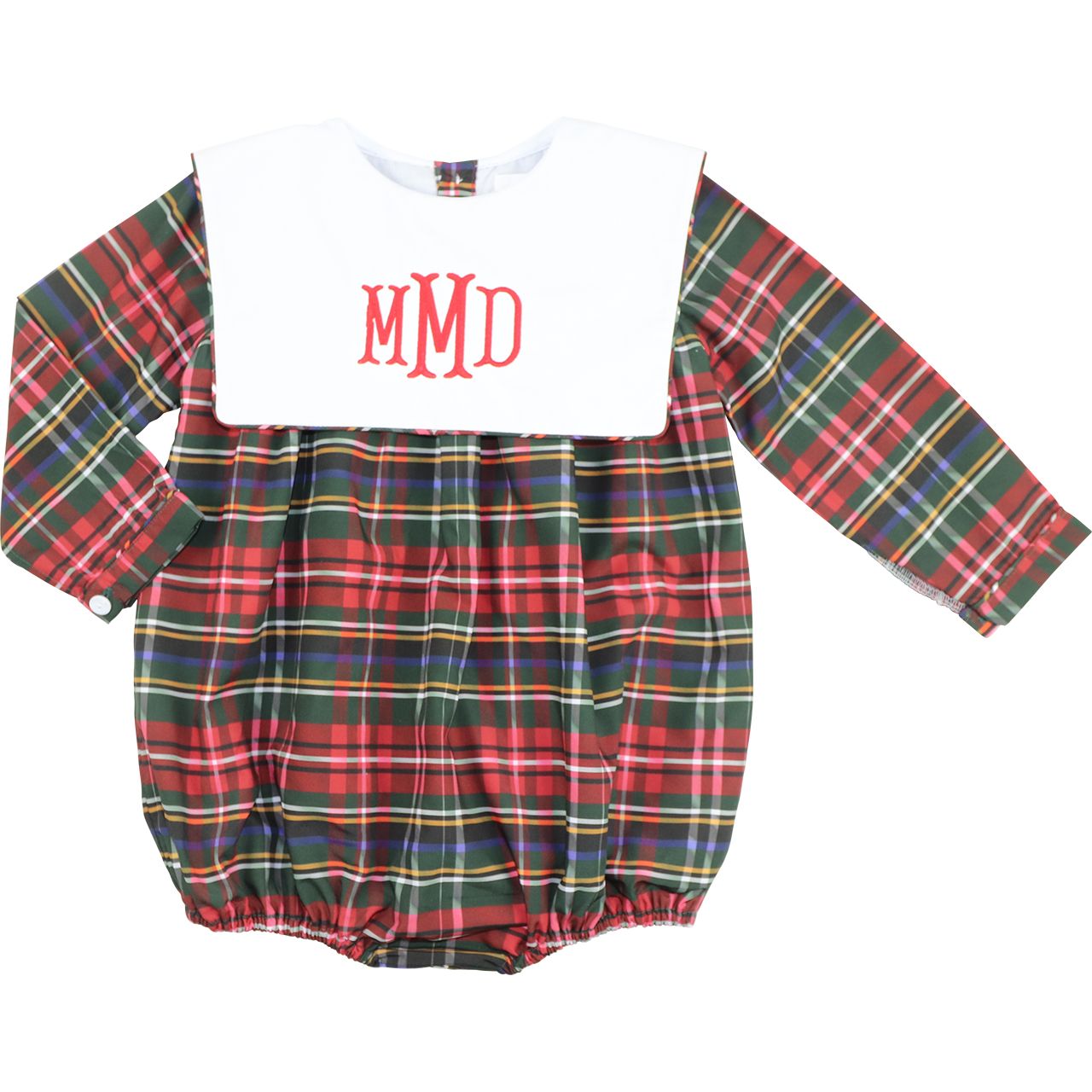 Wrap your little one in timeless holiday charm with this classic Green And Red Plaid Square Collar Bubble. The rich red, green, and navy tartan pattern is complemented by a crisp white bib collar with an optional elegant red monogram. Designed with elasticized leg openings and secure back buttons, this outfit is perfect for festive gatherings and family photos.