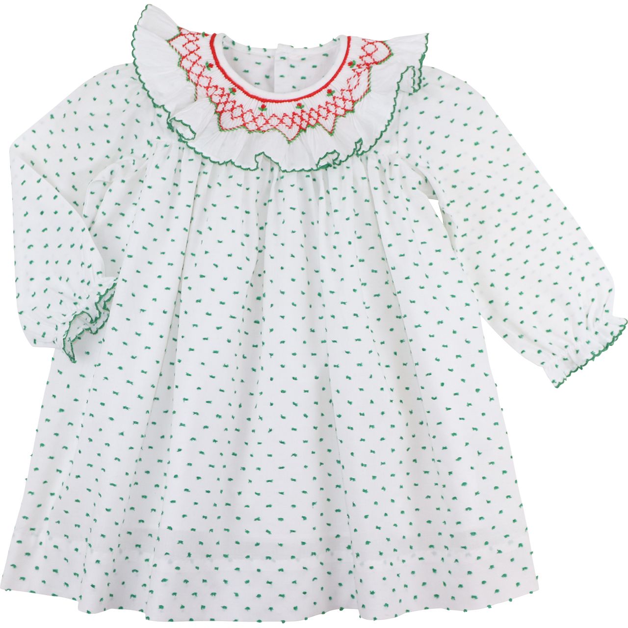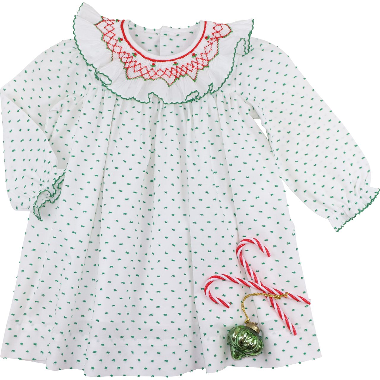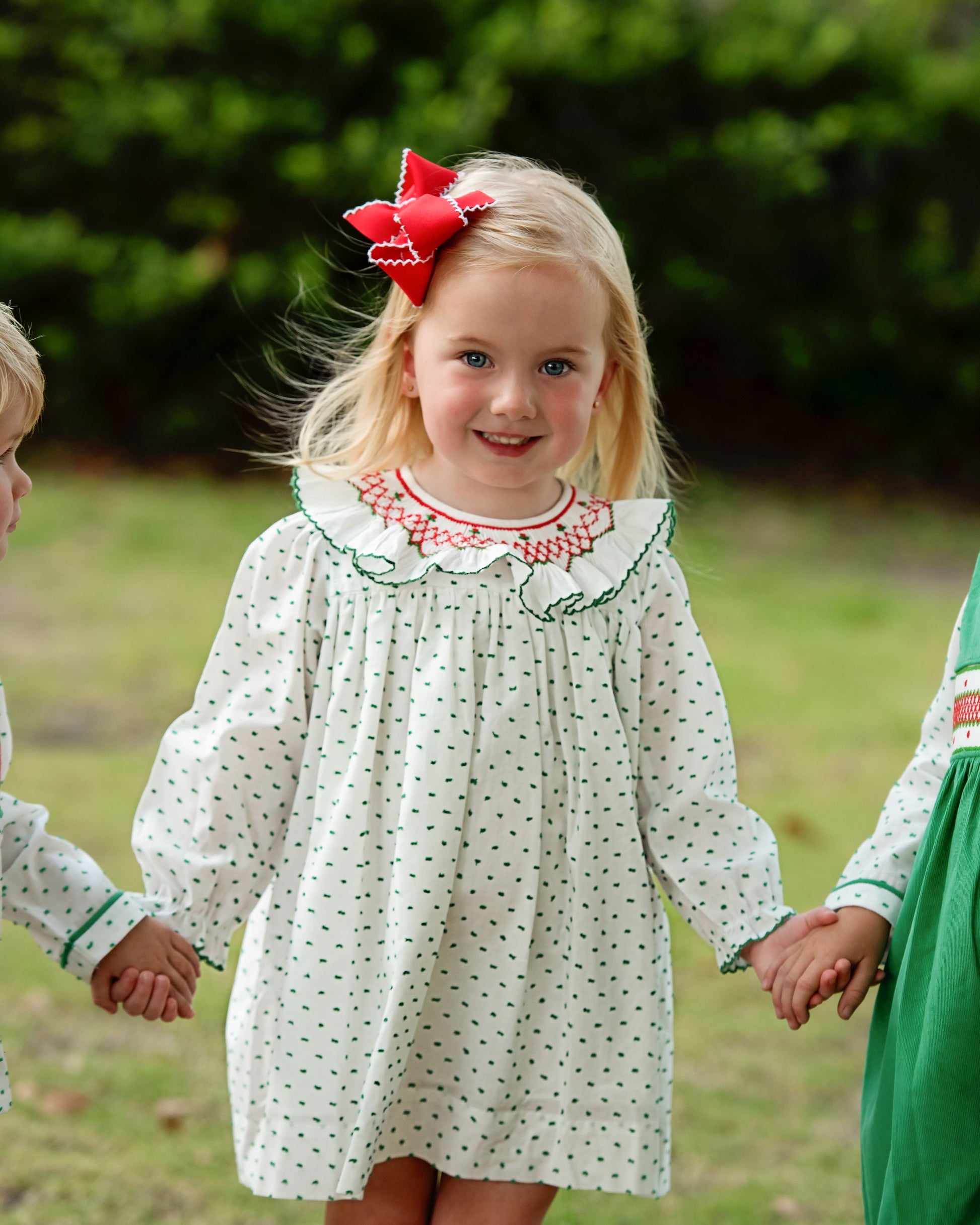 Delight in timeless holiday charm with this festive Green And Red Smocked Swiss Dot Dress, adorned with a statement ruffled collar. The neckline features intricate red and green smocking, adding a pop of color and handcrafted elegance. With its long sleeves and classic silhouette, this dress is perfect for celebrating special moments in cozy, seasonal style.