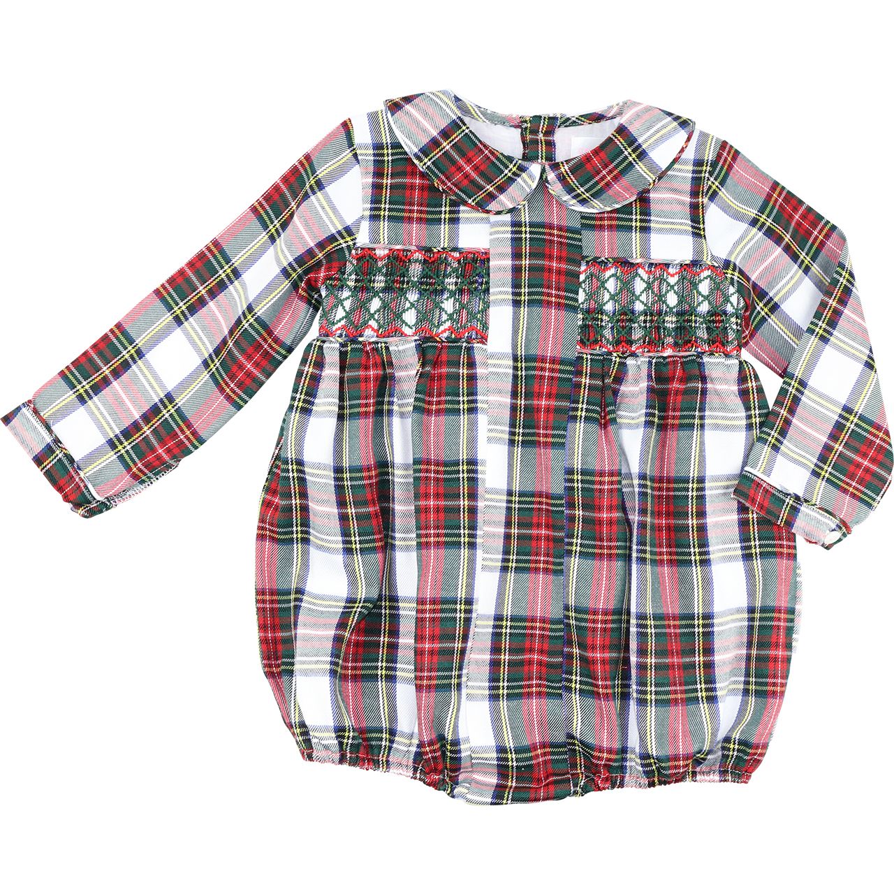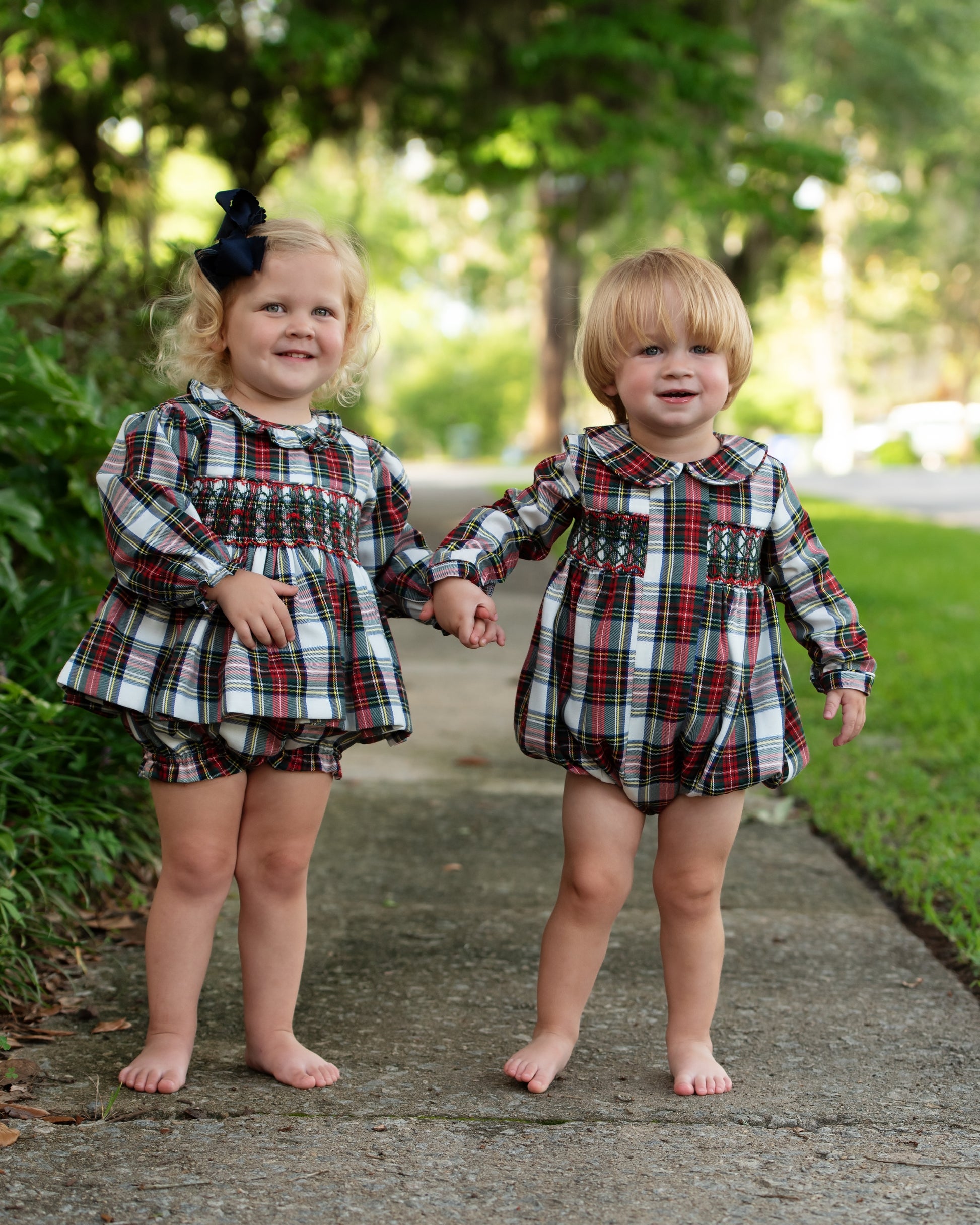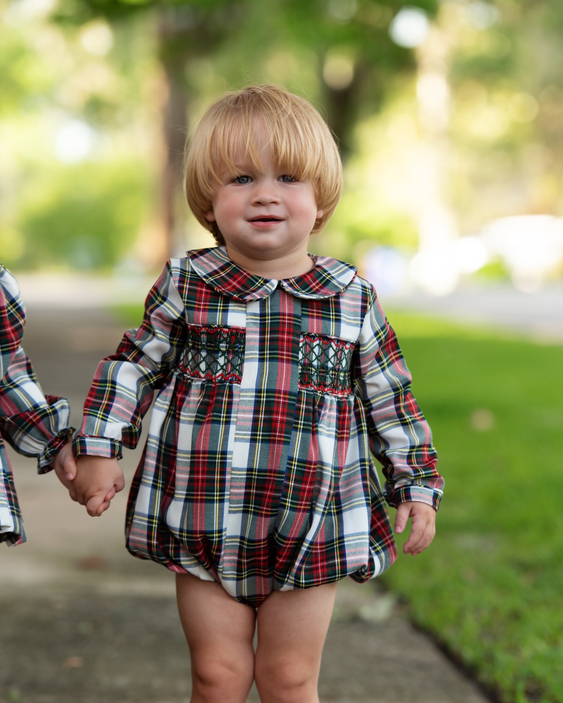 Dress your little one in classic holiday charm with this festive Holiday Tartan Smocked Bubble, featuring intricate hand-smocking across the chest in rich red and green tones. The Peter Pan collar and gathered leg openings add timeless detail and a snug, comfortable fit. Perfect for family gatherings or Christmas portraits, this bubble blends tradition and style in a cozy, cheerful ensemble.