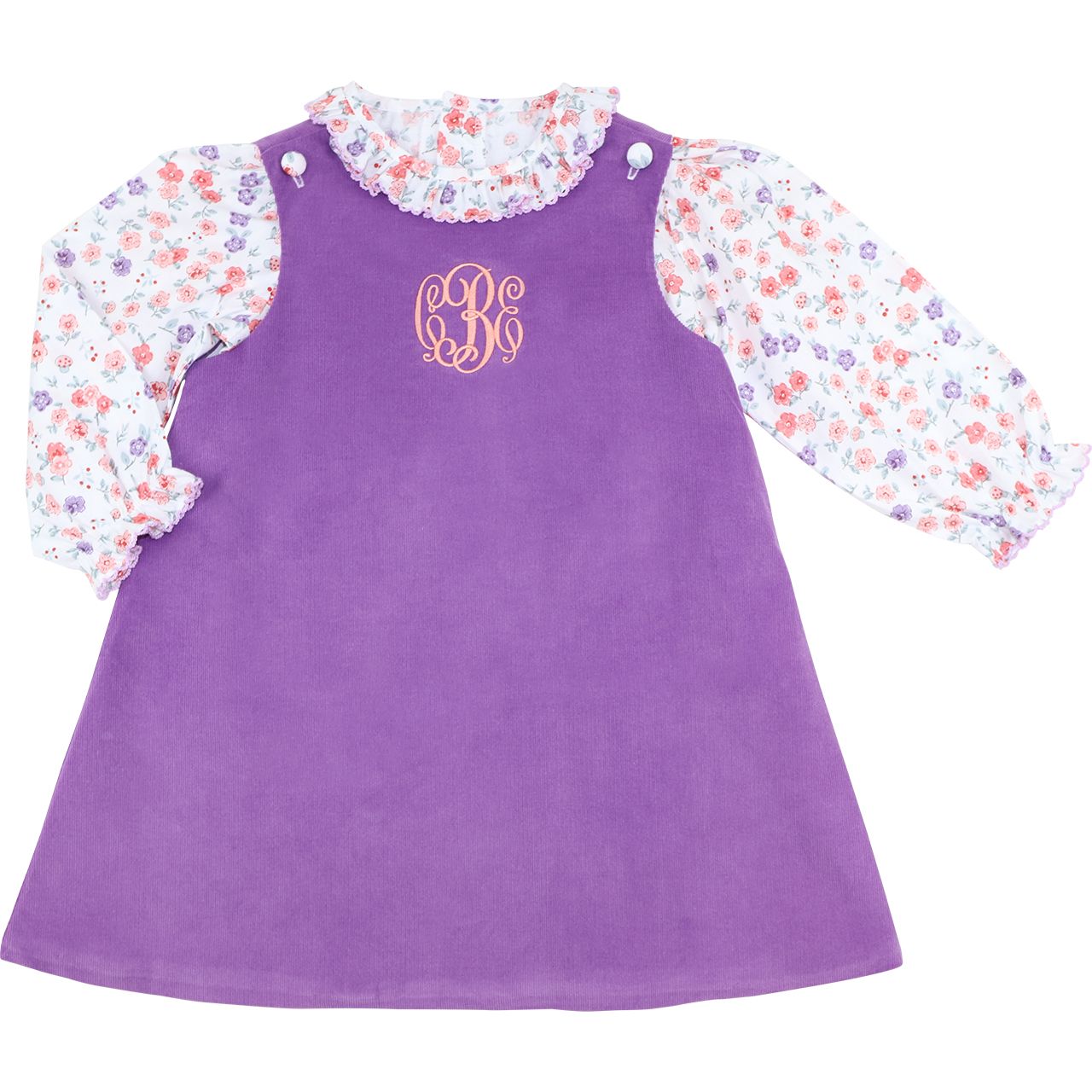 Brighten up her fall wardrobe with this charming Lavender Floral Corduroy Dress, featuring an optional monogram and sweet floral-print long sleeves shirt. The ruffled collar and embroidered accents add a touch of vintage flair, while soft fabric ensures all-day comfort. Perfect for seasonal photos, pumpkin patch outings, or personalized gift-giving.