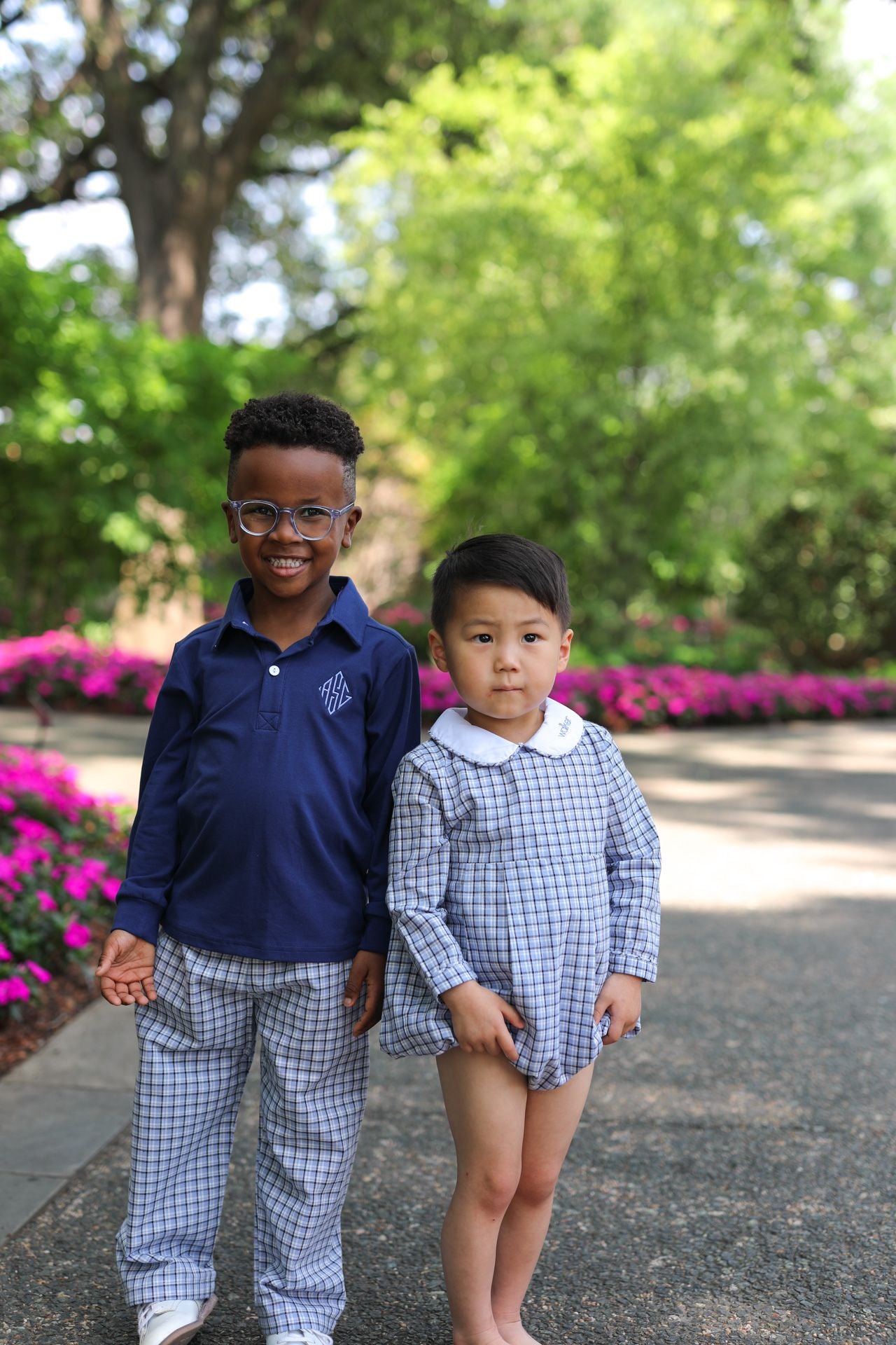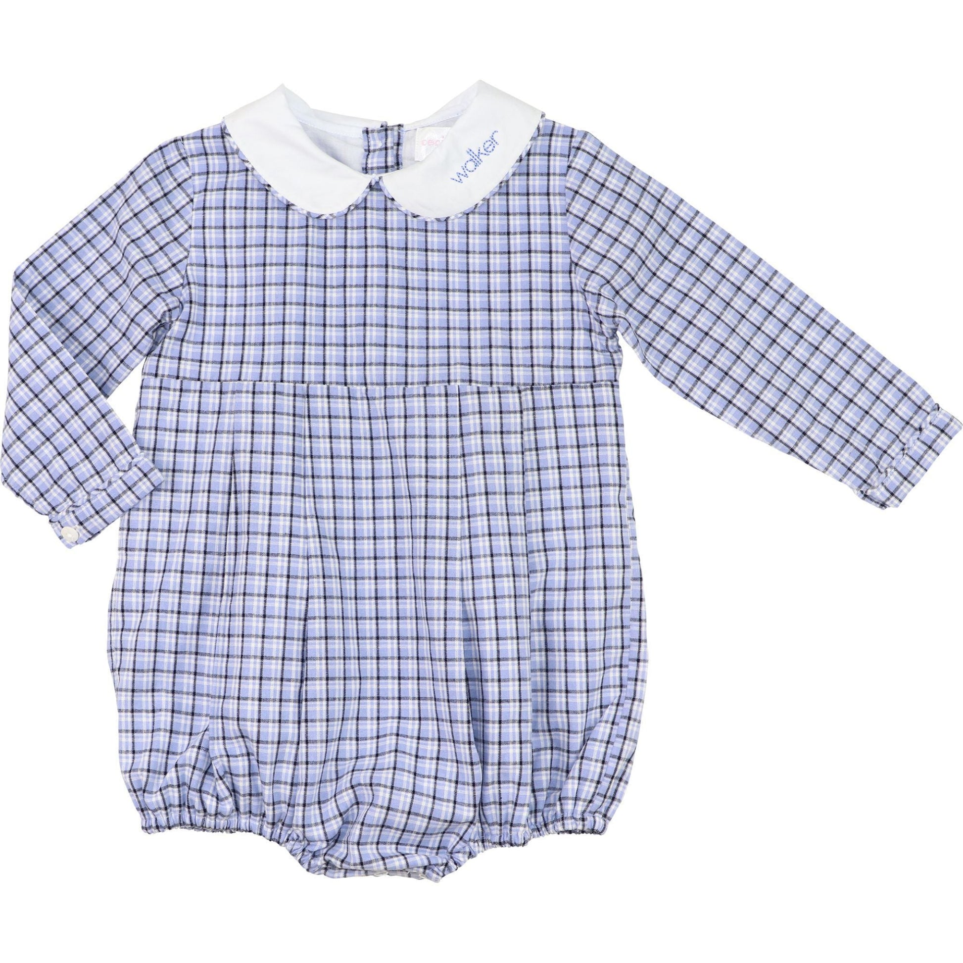 This adorable Navy And Blue Plaid Bubble features a soft blue and navy check pattern that’s perfect for cooler days. The crisp white Peter Pan collar can be beautifully embroidered with a custom name, adding a personal touch to this timeless style. Gentle pleating and elastic leg openings ensure a comfortable and charming fit for your little one.
