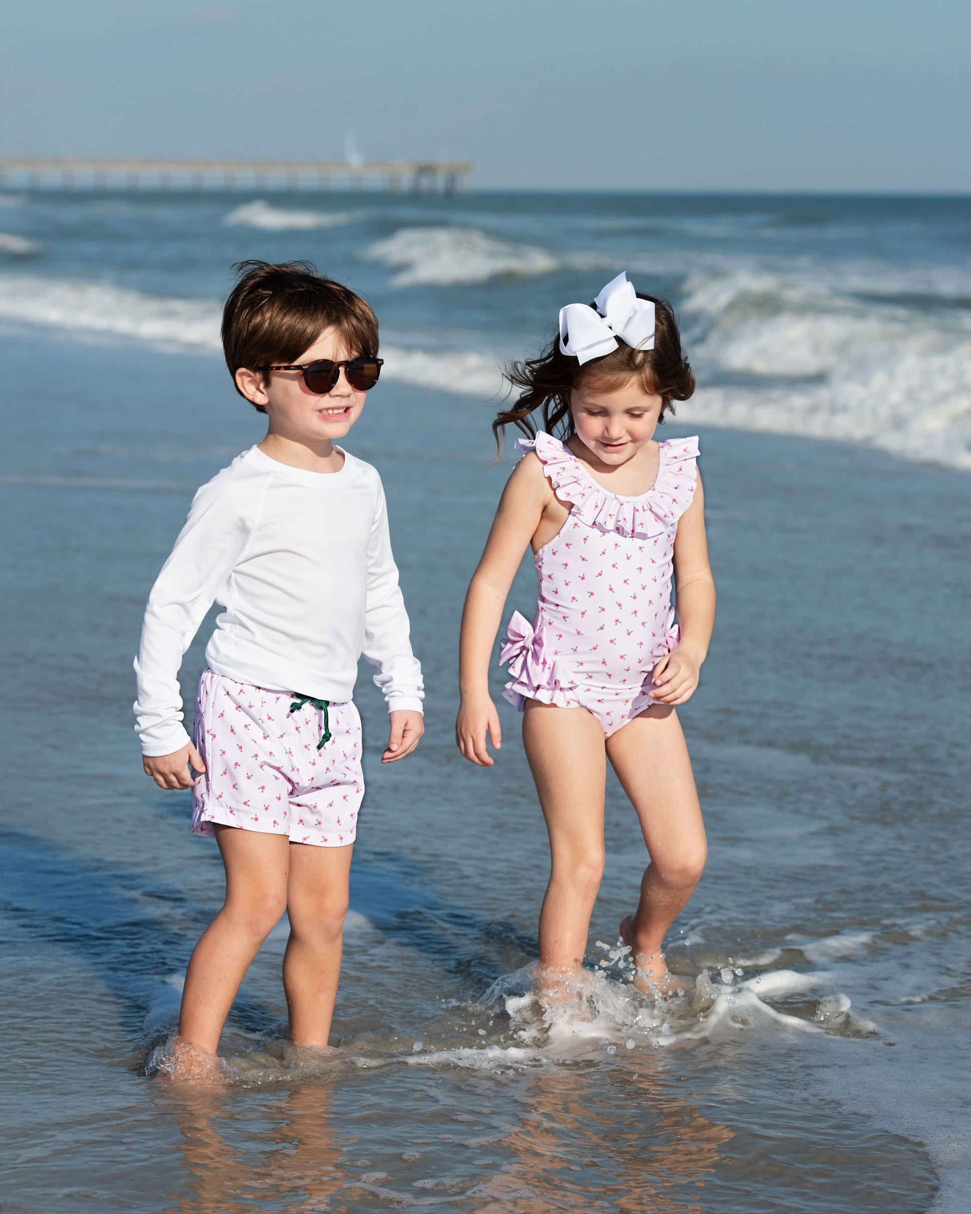 This charming one-piece swimsuit features a delicate pink floral print with a sweet ruffled neckline for an extra girly touch. Finished with oversized gingham bows and layered ruffles at the hips, it’s perfect for sunny beach days, poolside fun, and warm-weather adventures.