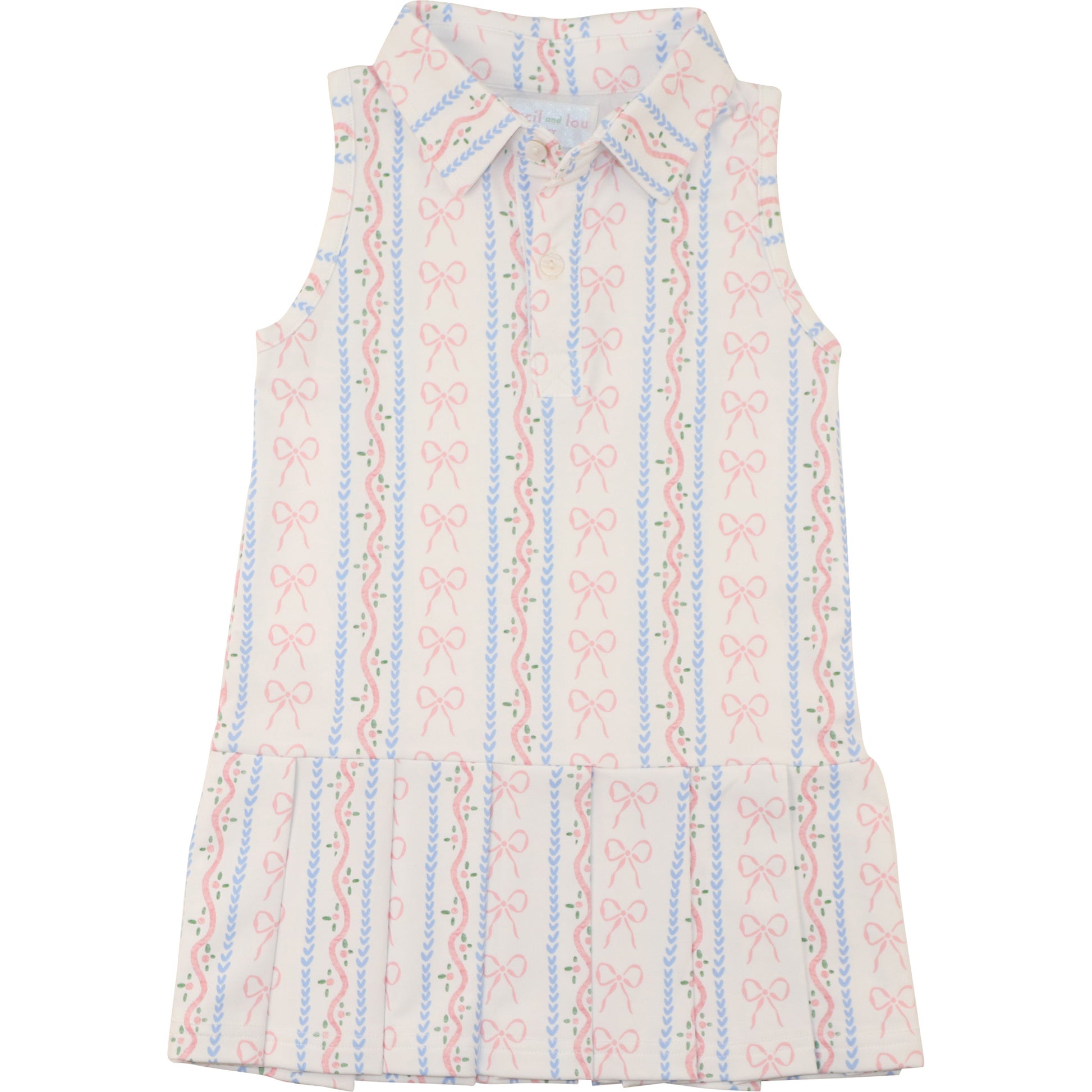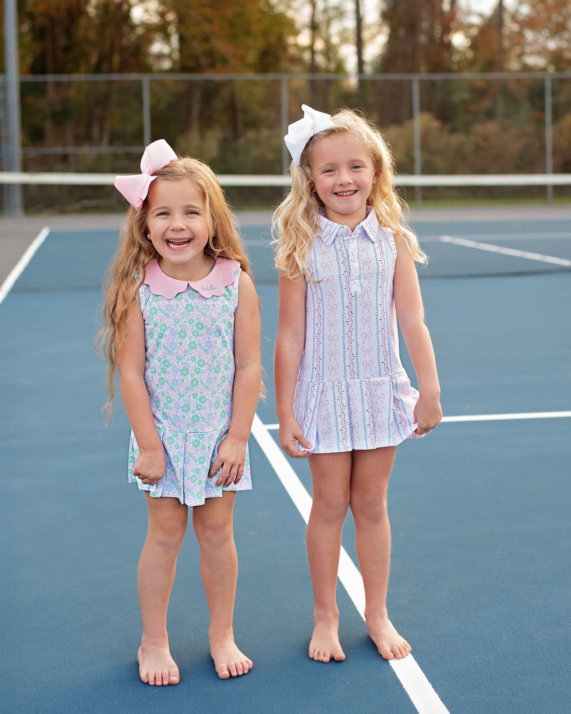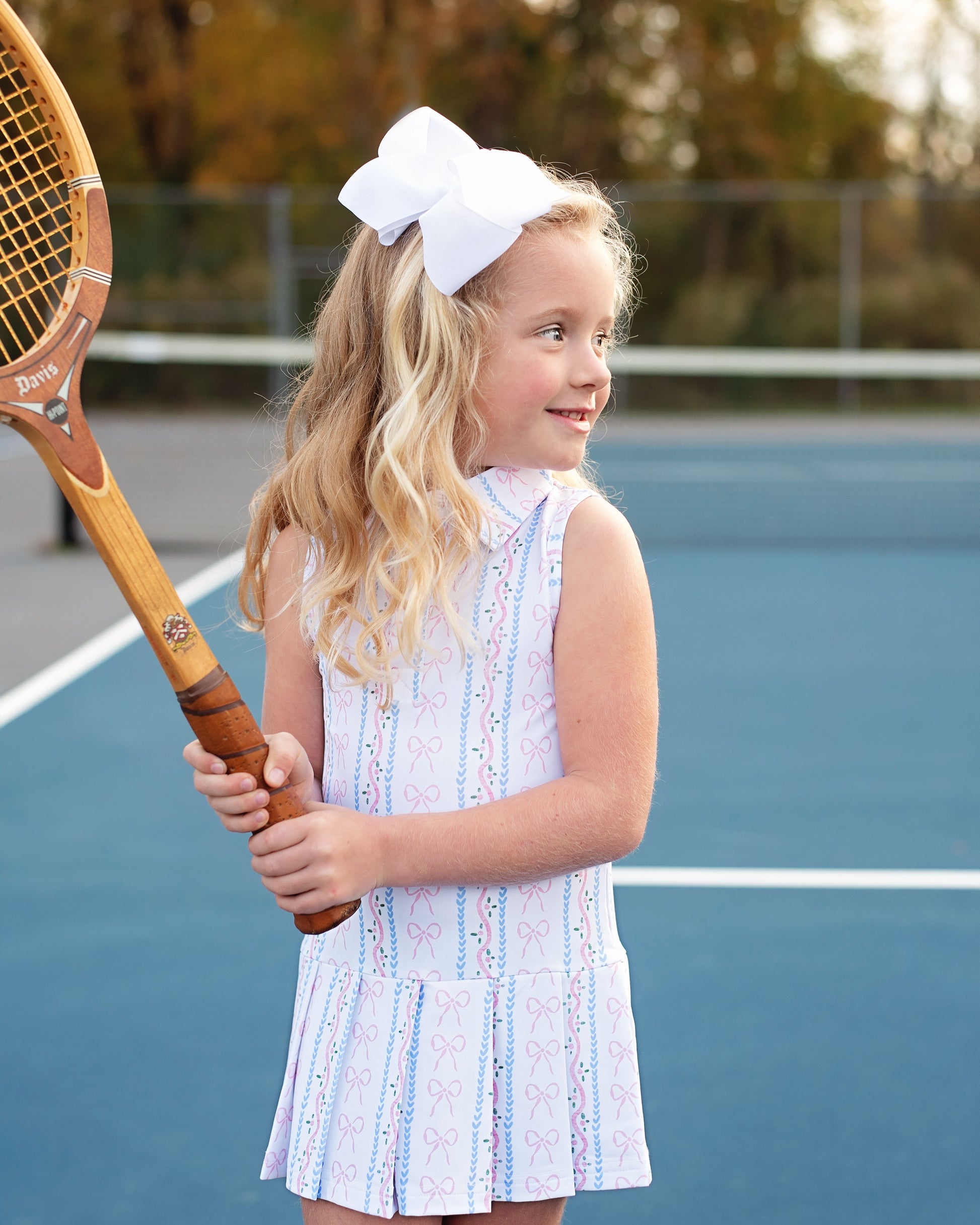 This classic Pink And Blue Bow Striped Knit Tennis Dress combines sporty style with all-day comfort, making it perfect for both play and casual wear. Designed with a lightweight, breathable fabric, it allows for easy movement on and off the court. A timeless piece, it’s ideal for active days or a chic, sporty look.