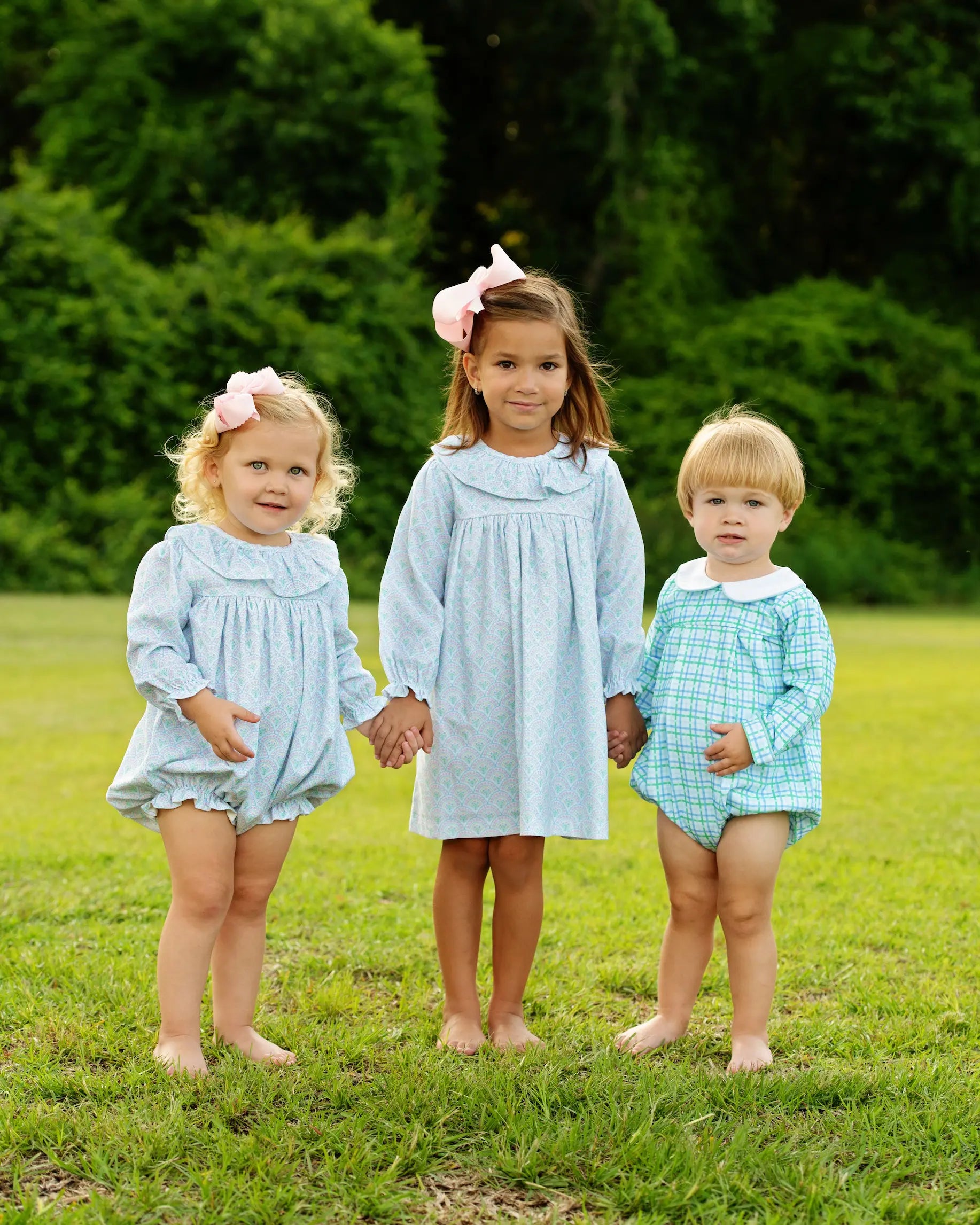 This darling Pink and Green Floral Corduroy Bubble features a sweet pastel scalloped floral fan print, complete with ruffled neckline and gathered detailing for a soft, vintage-inspired look. With elasticized cuffs and leg openings for comfort and snaps for easy changes, it’s perfect for special occasions or everyday charm.