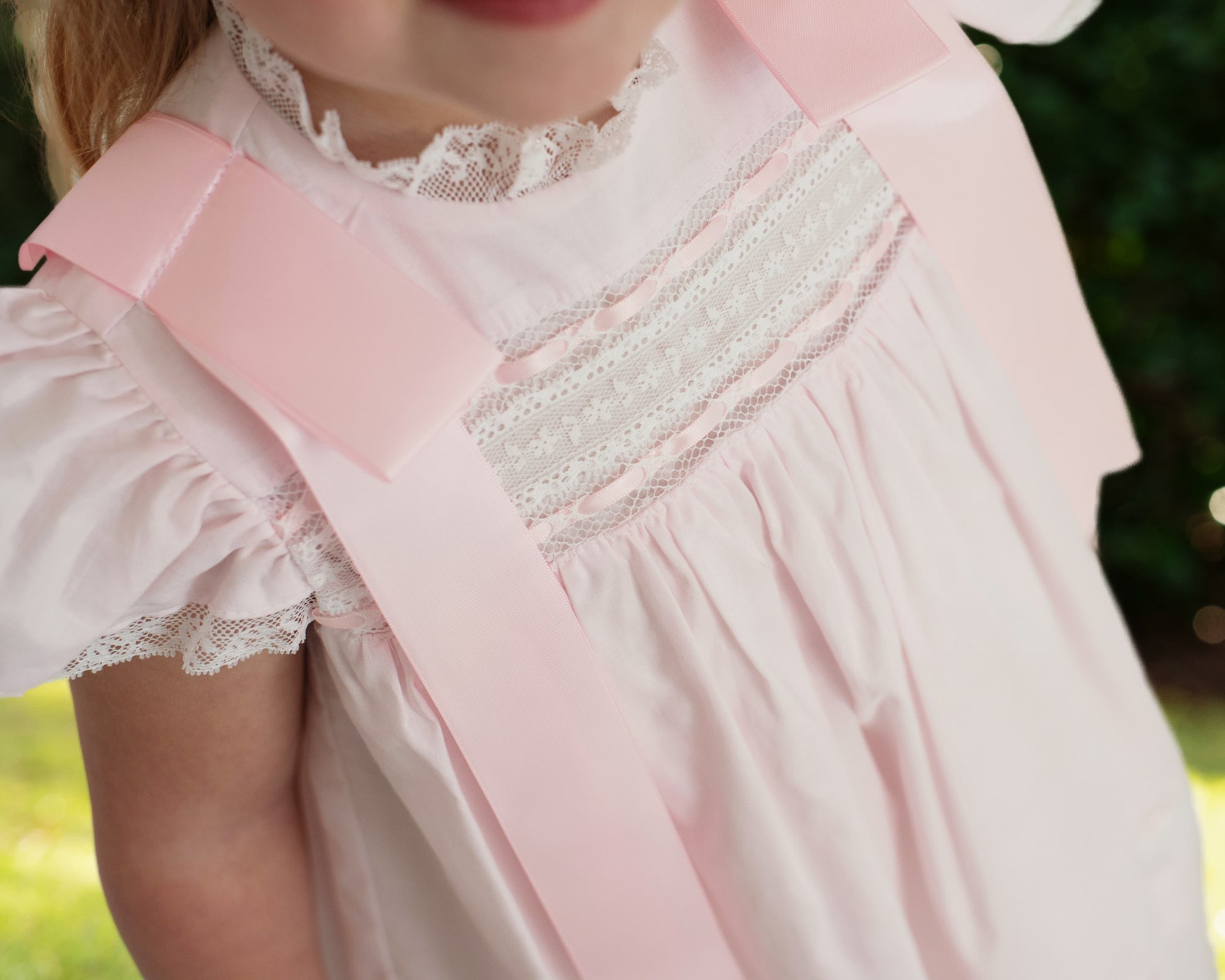This pink heirloom dress is a timeless treasure, adorned with delicate lace trim, pintuck detailing, and satin shoulder ribbons. Perfect for christenings, portraits, or special celebrations, it features flutter sleeves and a classic silhouette that captures vintage charm. Crafted from soft, lightweight fabric, this dress offers elegance and comfort for your little one's most cherished moments.