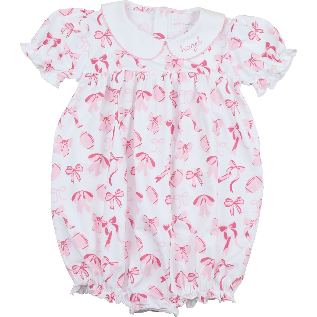 Let her shine on and off the field with our Pink Knit Football And Bow Bubble—a sporty, stylish pick for your all-star girl! Featuring an allover print of soft pink bows and footballs, this bubble is made for girls who love to hit the field and still sparkle with style. Made with lightweight, breathable fabric, this bubble is perfect for game day celebrations, team parties, or back-to-school fun.
