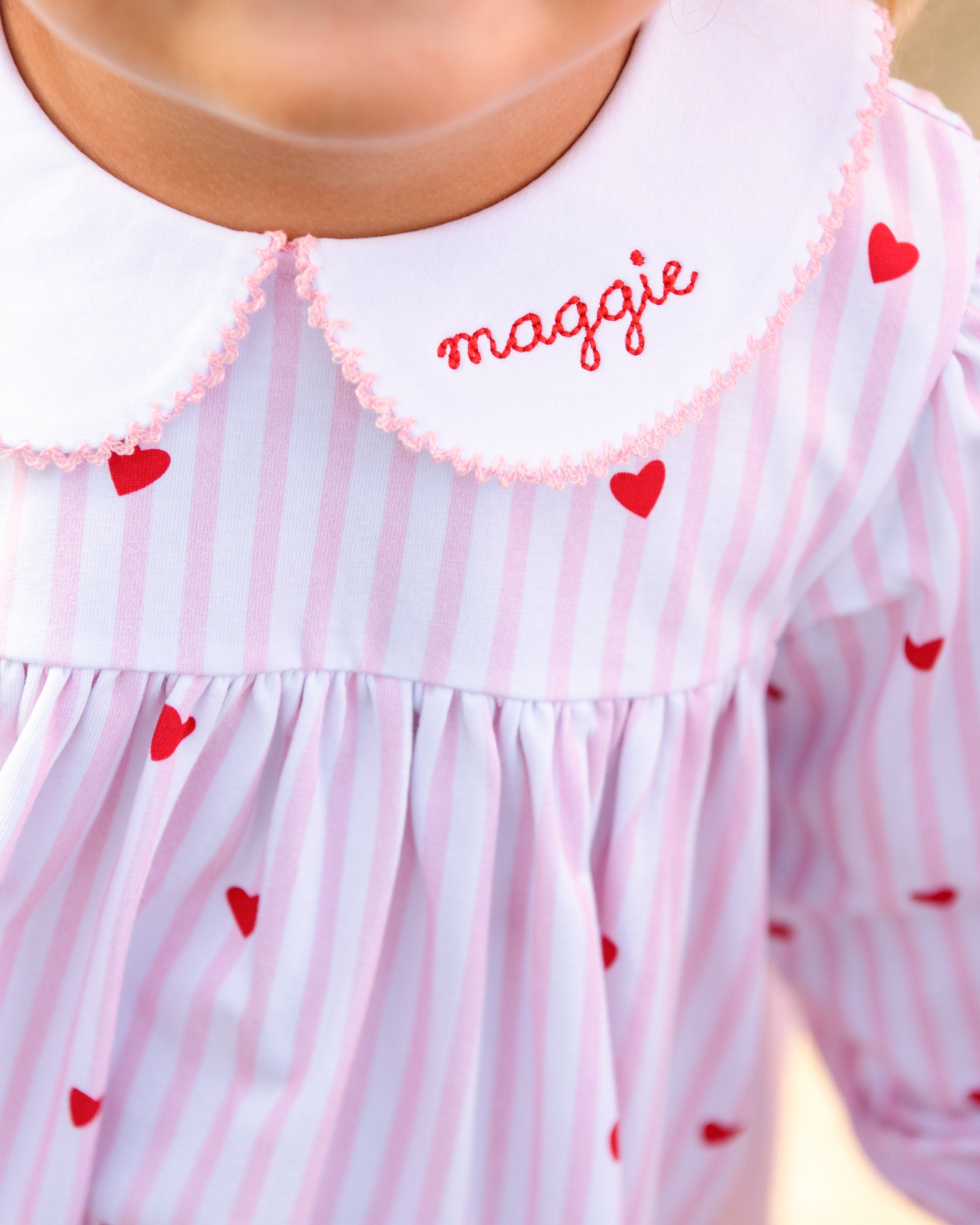 Your little sweetheart will look adorable in this pink and white striped long bubble adorned with red hearts. Featuring a Peter Pan collar with delicate trim and optional personalized embroidery, this charming outfit is perfect for Valentine’s Day or any special occasion.