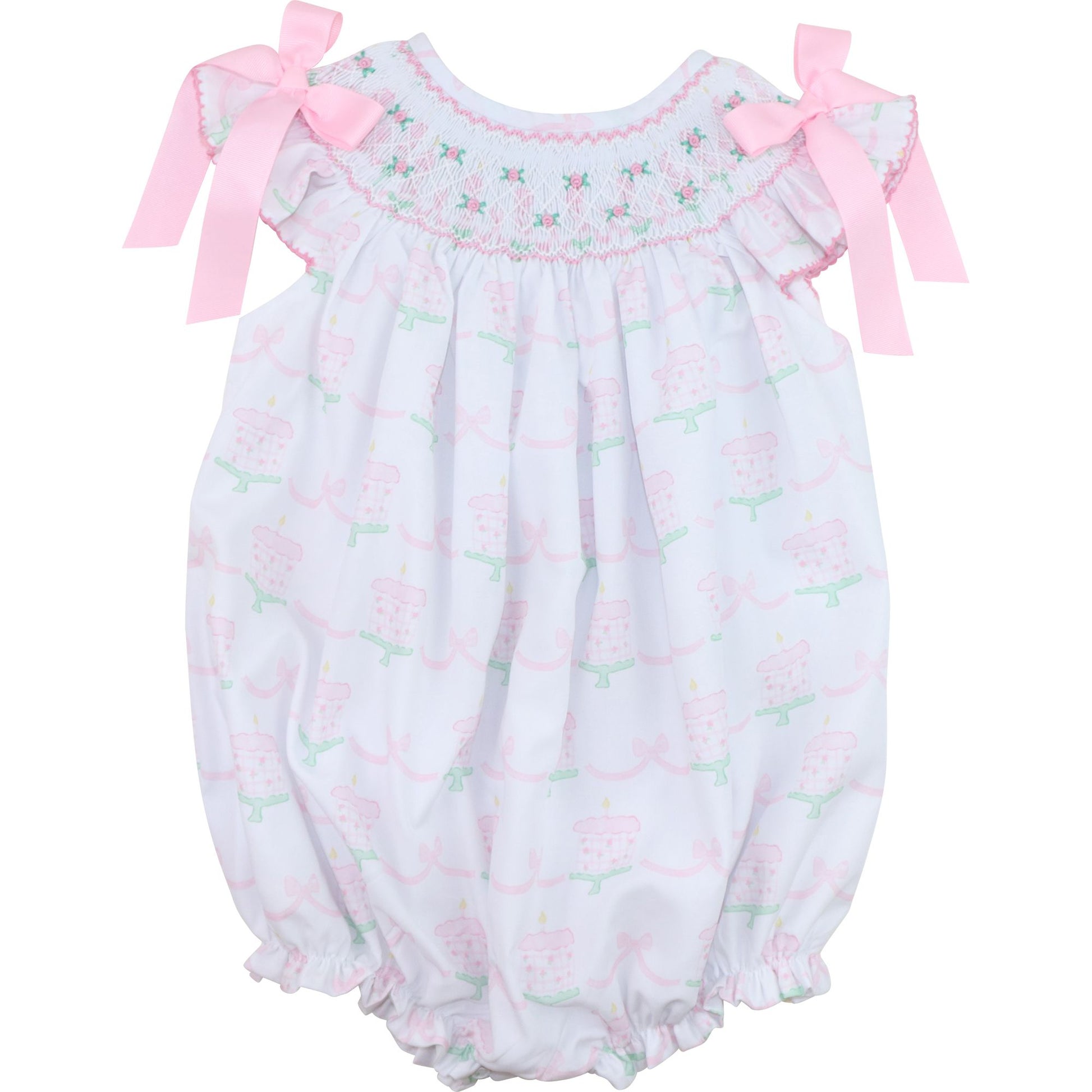 Celebrate your little one's special day in style with this pink and green smocked birthday cake bow bubble from Cecil & Lou, featuring delicate smocking, charming bows, and an adorable birthday cake print. Perfect for parties and photos, this sweet bubble romper offers a timeless, festive look with a comfortable fit for all-day wear.