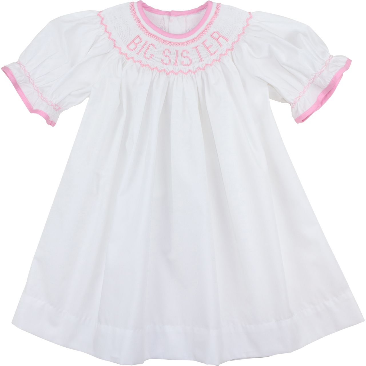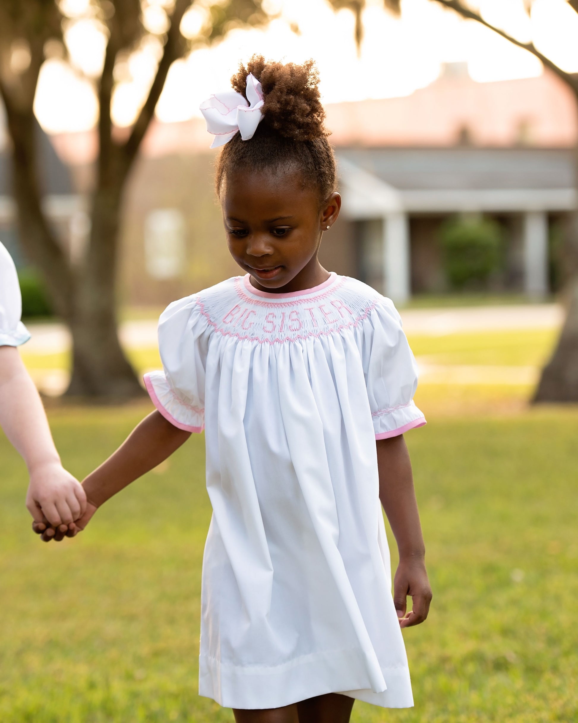 Announce her new title in timeless style with this Pink Smocked Big Sister Dress, featuring hand-smocked pink embroidery across the neckline. The puff sleeves and soft trim details add classic Southern charm, while the lightweight fabric ensures all-day comfort. Perfect for special occasions, sibling photos, or baby announcements.