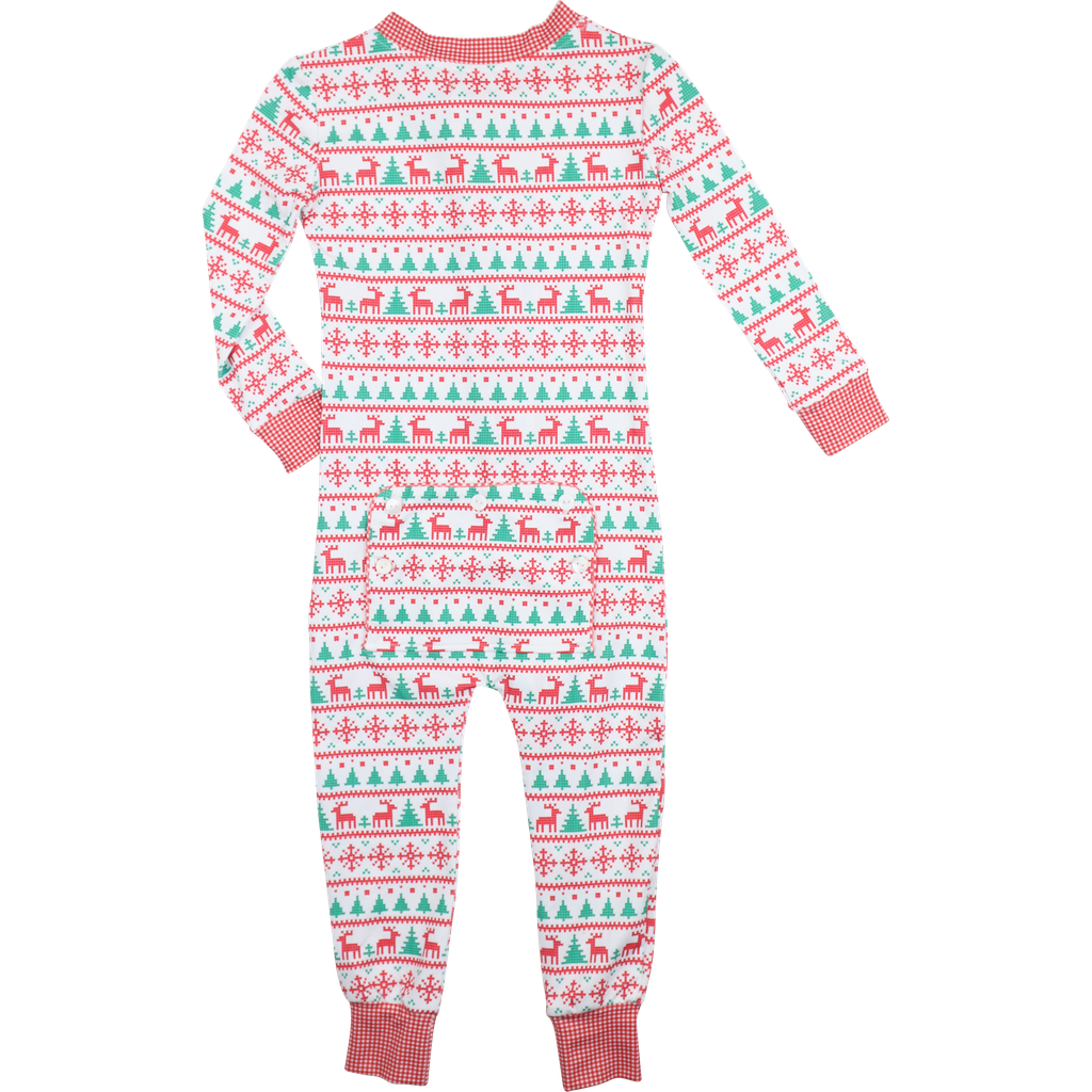 These festive Red And Green Christmas Print Knit Zipper Pajamas feature a cheerful red, green, and white Fair Isle pattern with reindeer, snowflakes, and Christmas trees. Finished with red gingham trim and a playful back flap, they bring cozy comfort and seasonal charm to bedtime.