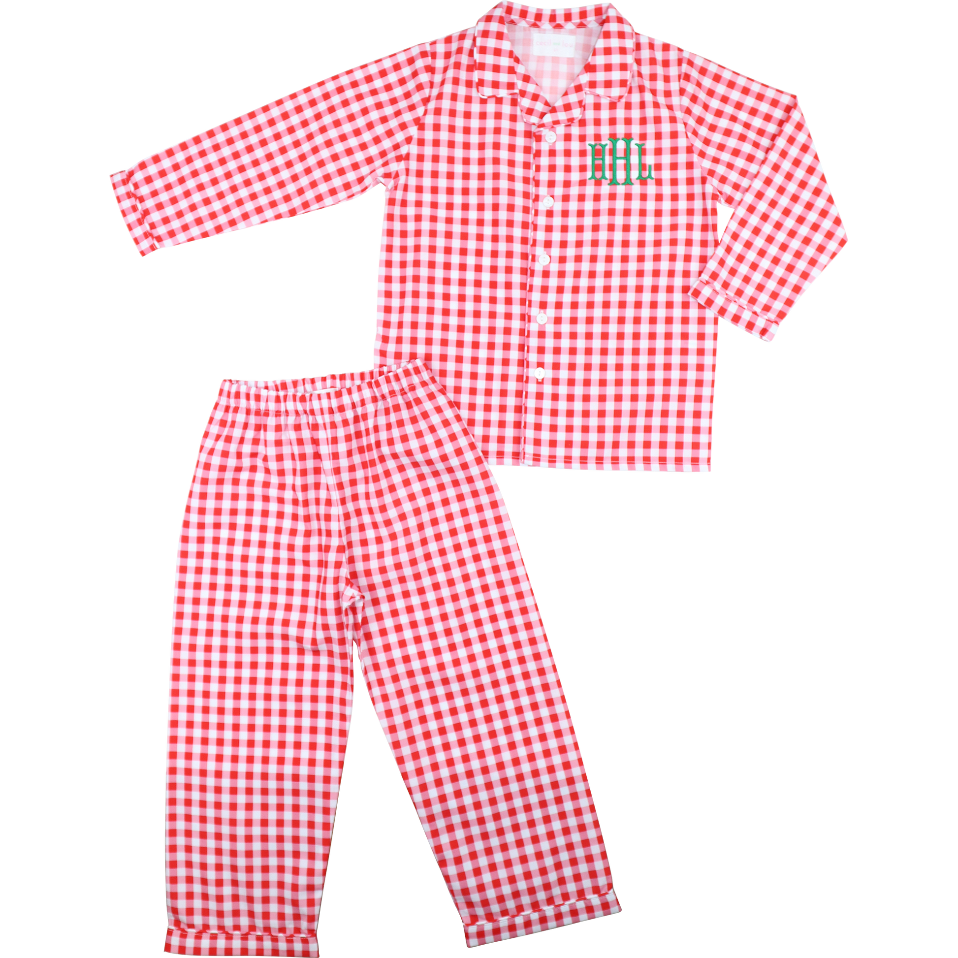 These classic Red And White Check Pajamas feature a button-up top with optional green monogram embroidery for a personalized touch. Paired with elastic-waist pants, they offer a cozy and timeless look perfect for holiday mornings or year-round comfort.
