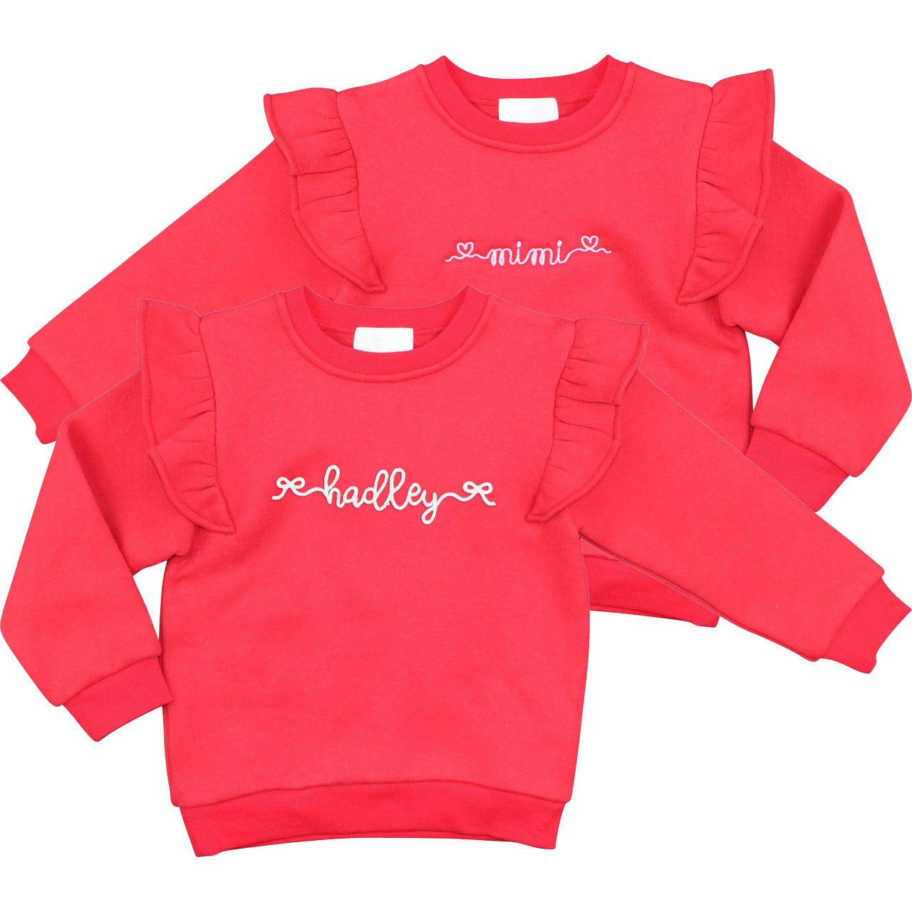 Brighten up her everyday style with this vibrant Red Ruffle Sweatshirt, featuring charming ruffle sleeves and an optional sweet personalized embroidery design. Made from soft, cozy fabric, it offers warmth and comfort while adding a playful flair to any outfit. Perfect for cooler days, this pullover is a fun and fashionable favorite for your little trendsetter.