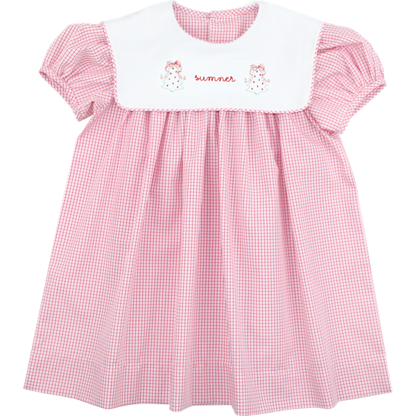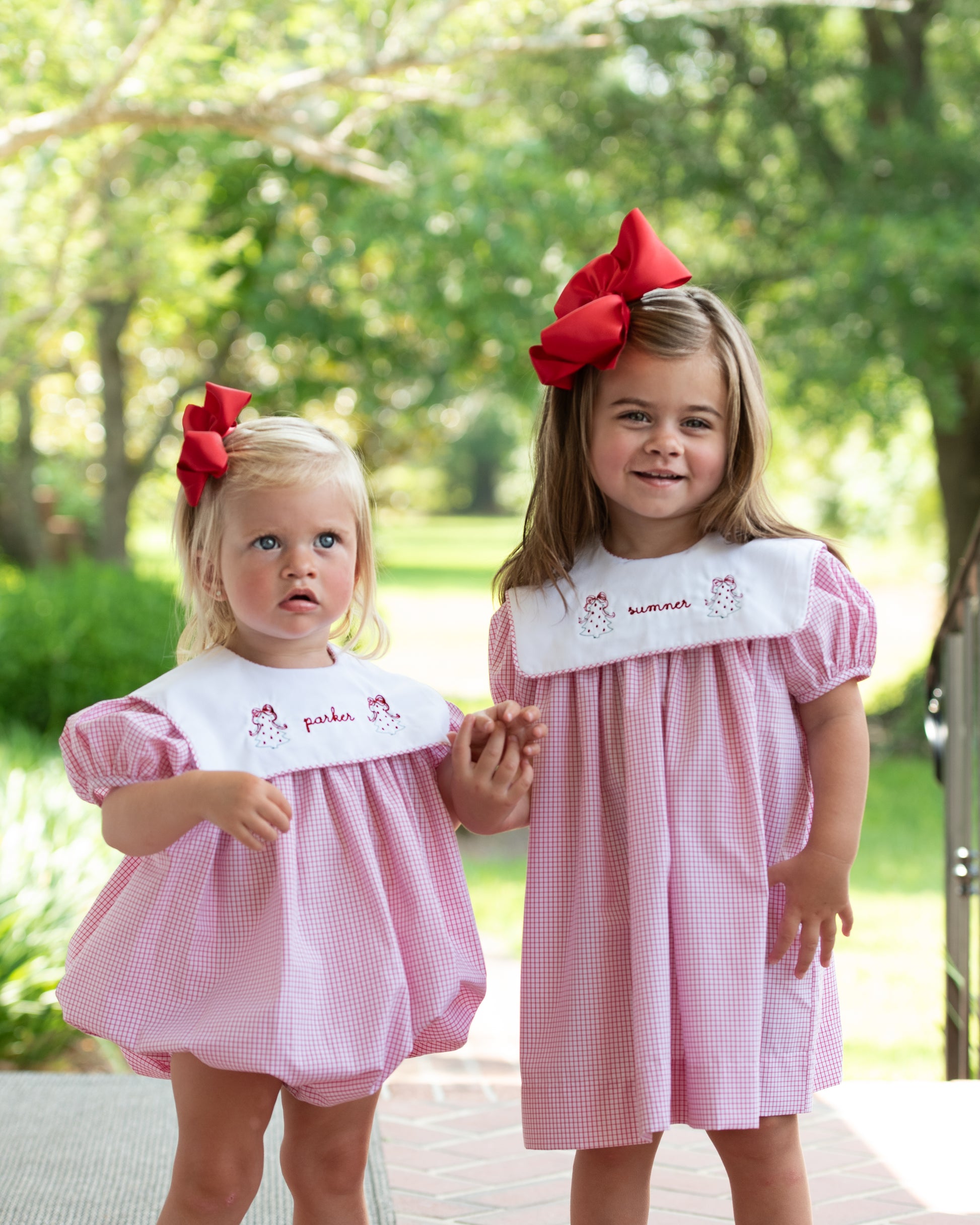 This adorable Red Windowpane Square Collar Dress features puff sleeves and a crisp white yoke with optional name embroidery with Christmas trees. Perfect for holiday celebrations, it blends festive charm with timeless style for your little one.